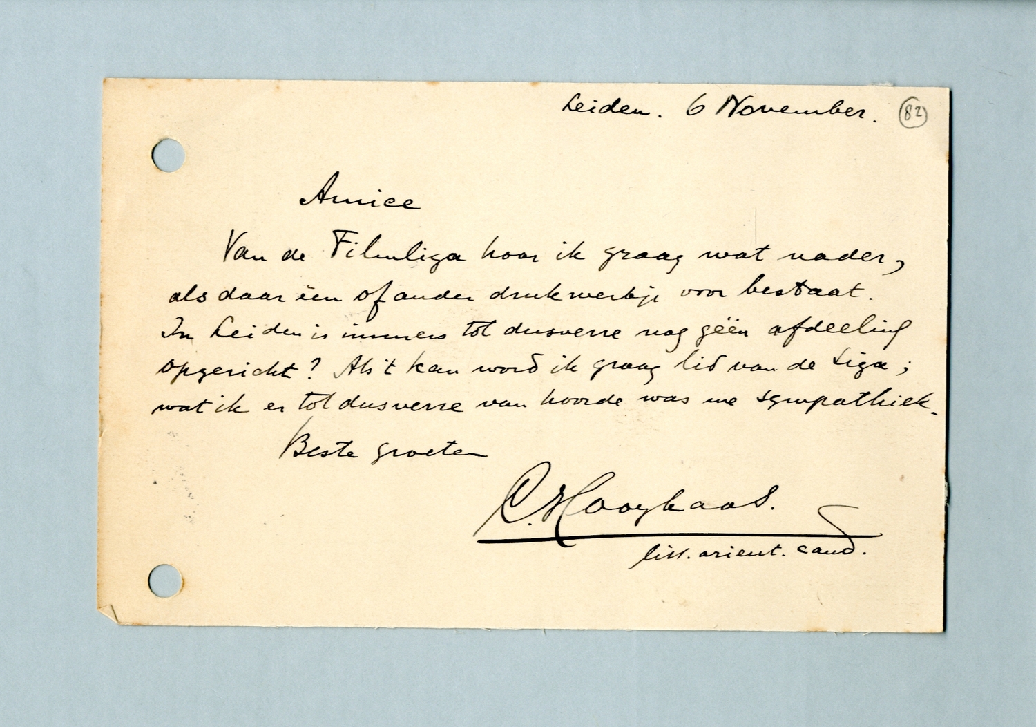 Van de Filmliga hoor ik graag wat nader, als daar één of ander drukwerkje voor bestaat. In Leiden is immers tot dusverre nog géén afdeeling opgericht? Als 't kan word ik graag lid van de Liga; wat ik er tot dusverre van hoorde was me sympathiek.