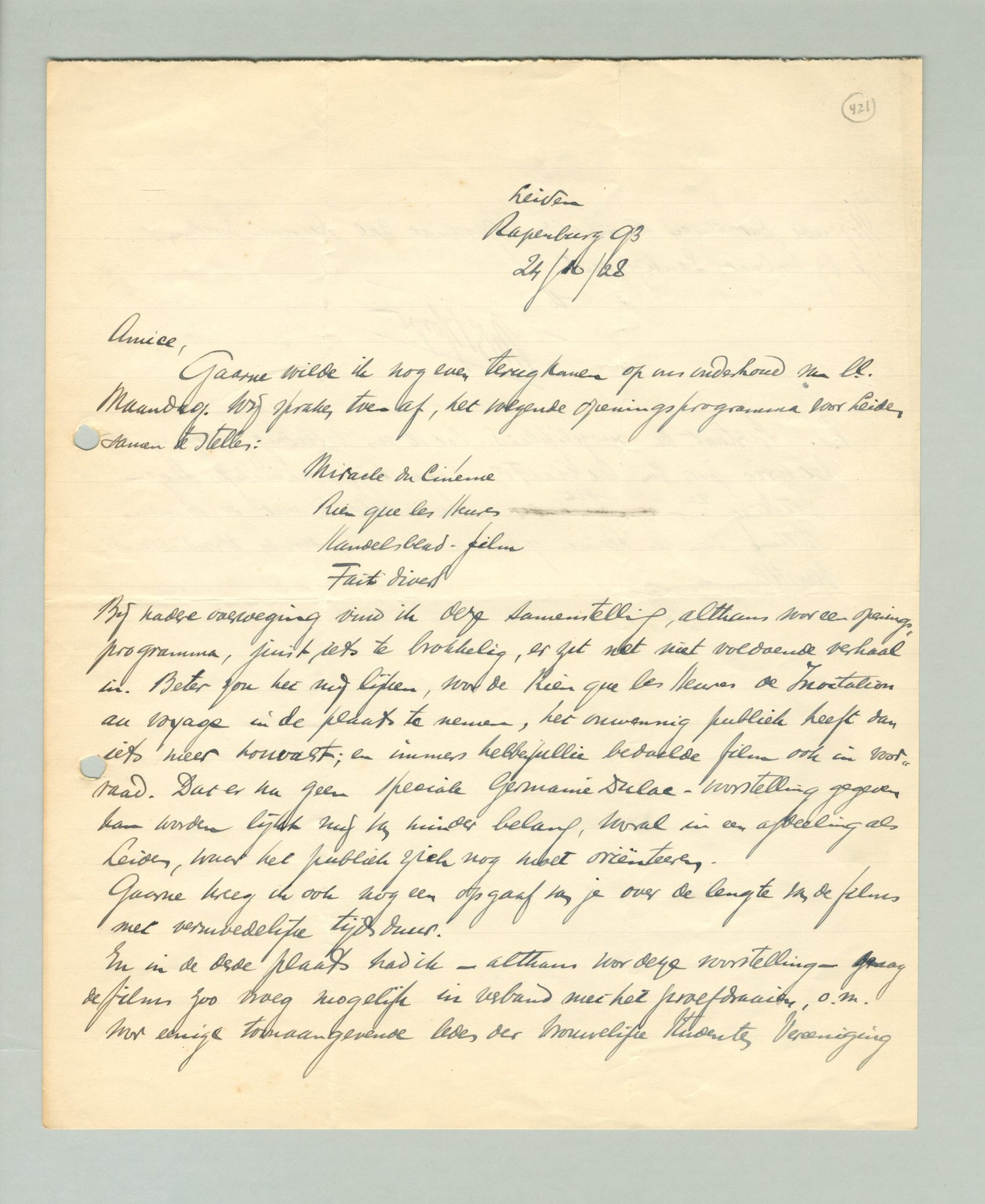 Bij nadere overweging vind ik deze samenstelling, althans voor een openingsprogramma, juist iets te brokkelig, er zit net niet voldoende verhaal in. Beter zou het mij lijken, voor de Rien que les Heures de Invitation au voyage in de plaats te nemen, het onwennig publiek heeft dan iets meer houvast; en immers hebben jullie bedoelde films ook in voorraad. Dat er nu geen speciale Germaine Dulac-voorstelling gegeven kan worden lijkt mij van minder belang, vooral in een afdeeling als Leiden, waar het publiek zich nog moet oriënteeren.