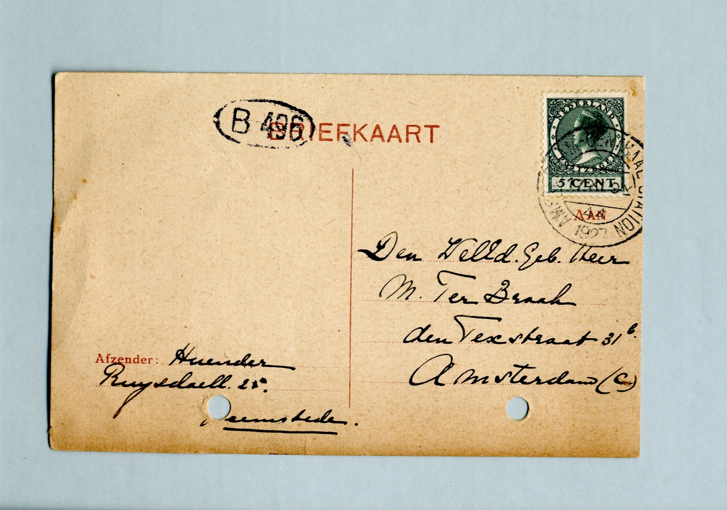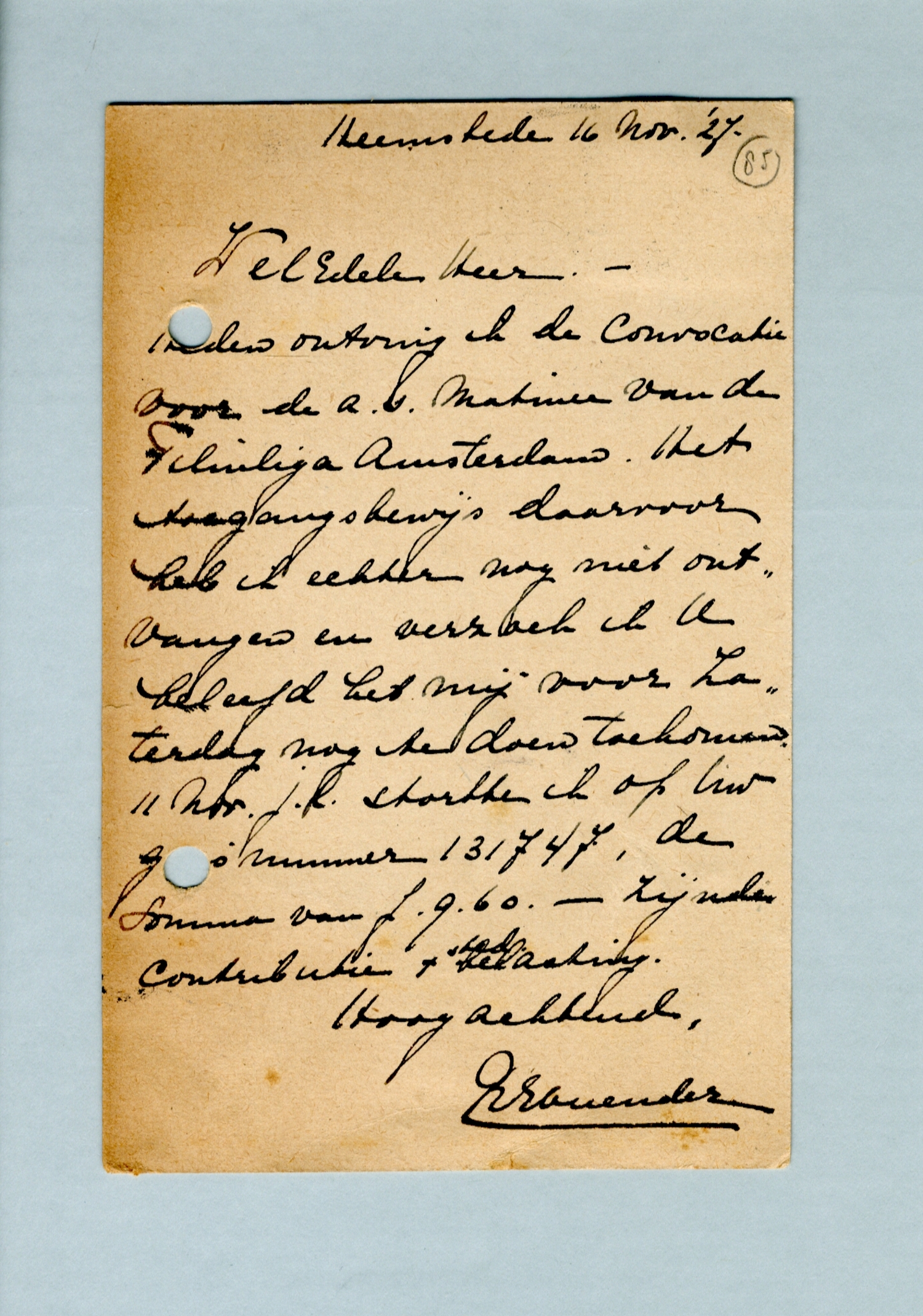 Heden ontving ik de convocatie voor a.s. matinee van den Filmliga Amsterdam. Het toegangsbewijs daarvoor heb ik echter nog niet ontvangen en verzoek ik U beleefd het mij voor Zaterdag nog te doen toekomen. 11 Nov. j.l. stortte ik op Uw gironummer 131747, den somma van f 9.60. - Zijnde contributie + belasting.