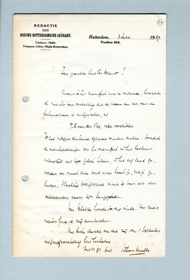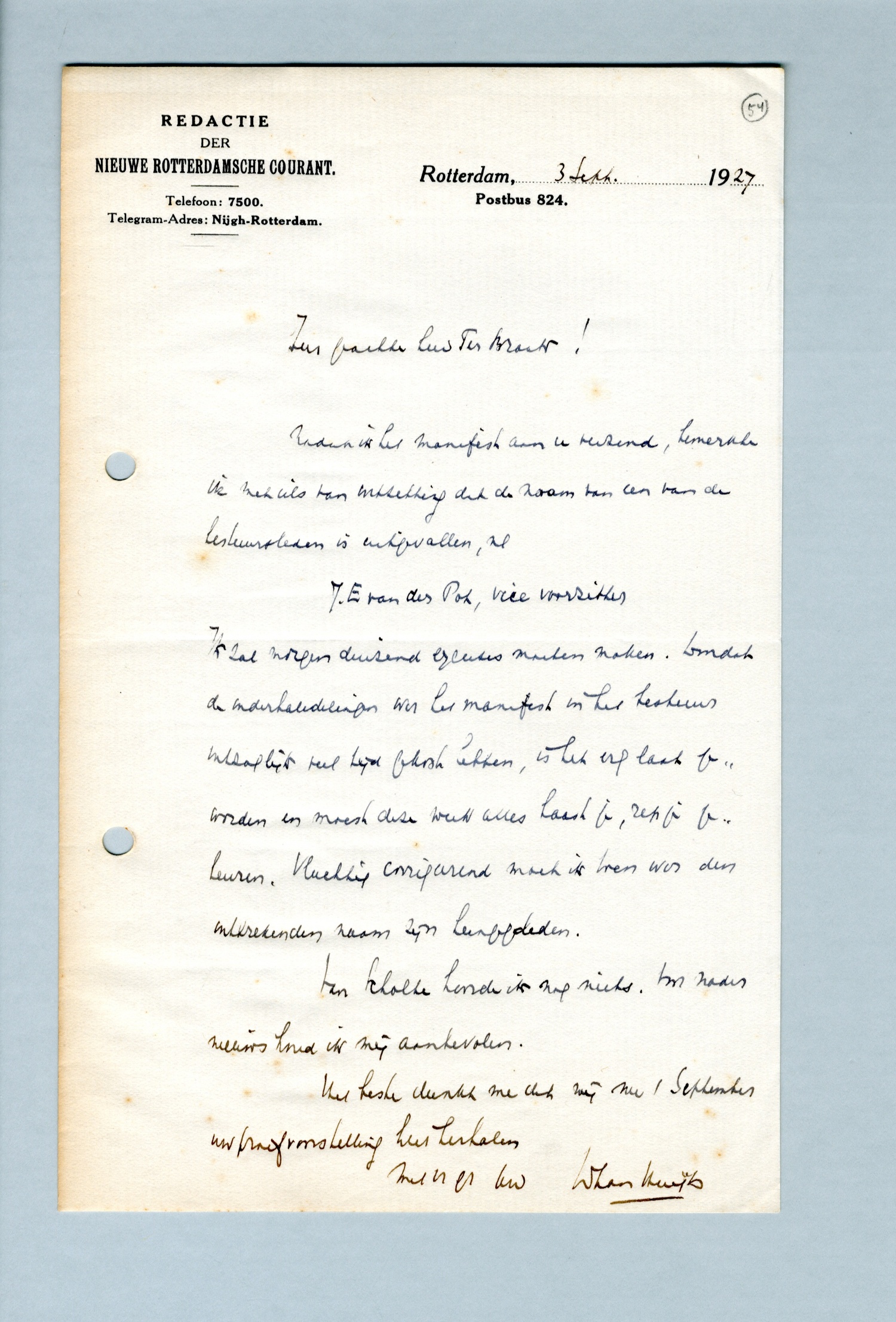 Ik zal morgen duizend excuses moeten maken. Doordat de onderhandelingen over het manifest in het bestuur ontzaglijk veel tijd gekost hebben, is het erg laat geworden en moest deze week alles haast je, rep je gebeuren. Vluchtig corrigeerend moet ik toen over den ontbrekenden naam zijn heengegleden.