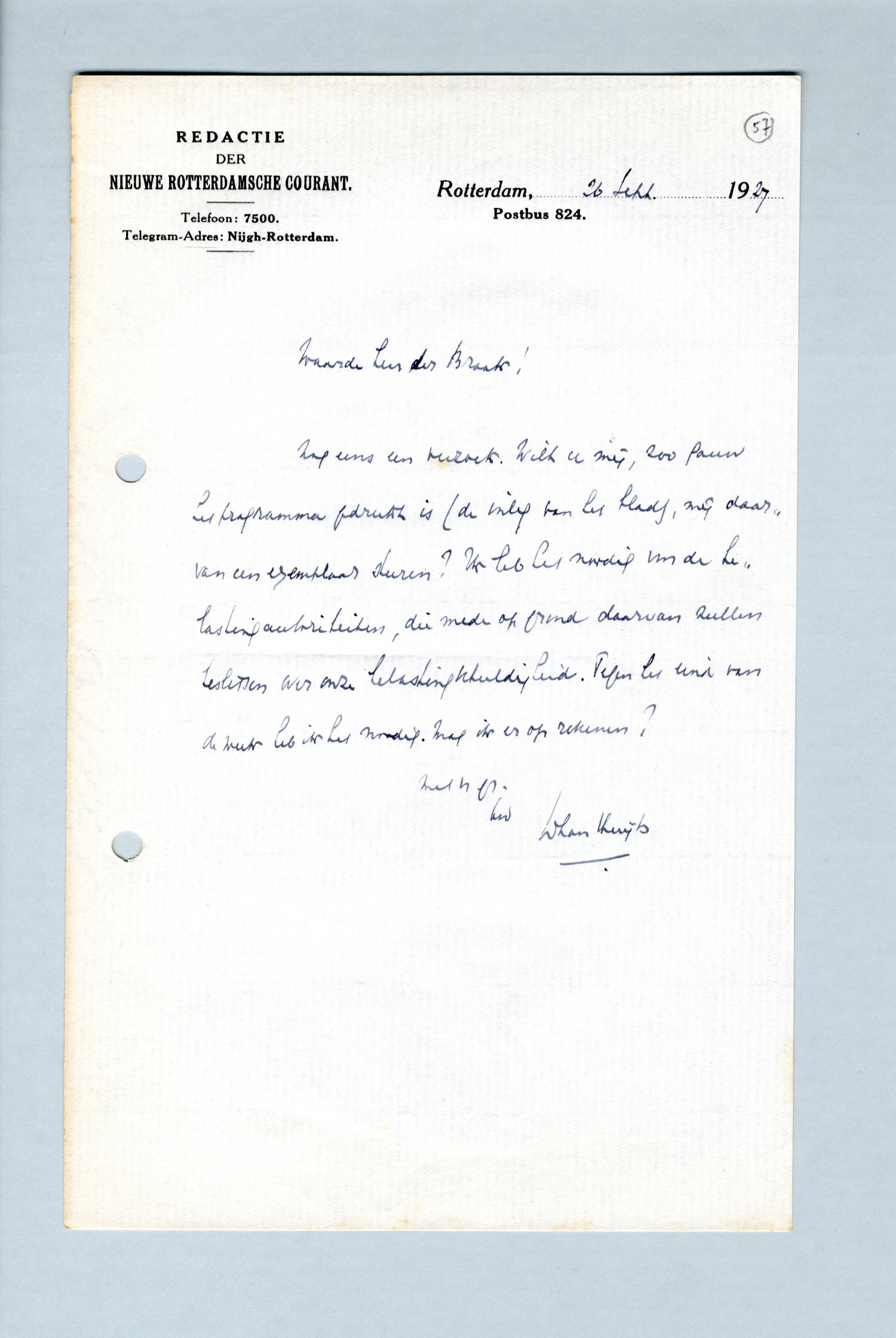 Nog eens een verzoek. Wilt u mij, zoo gauw het programma gedrukt is (de inleg van het blad), mij daarvan een exemplaar sturen? Ik heb het noodig voor de belastingautoriteiten, die mede op grond daarvan zullen beslissen over onze belastingschuldigheid. Tegen het eind van de week heb ik het noodig. Mag ik er op rekenen?