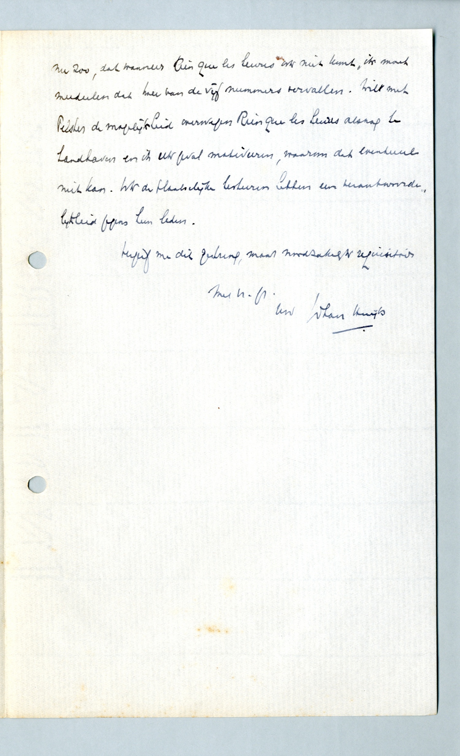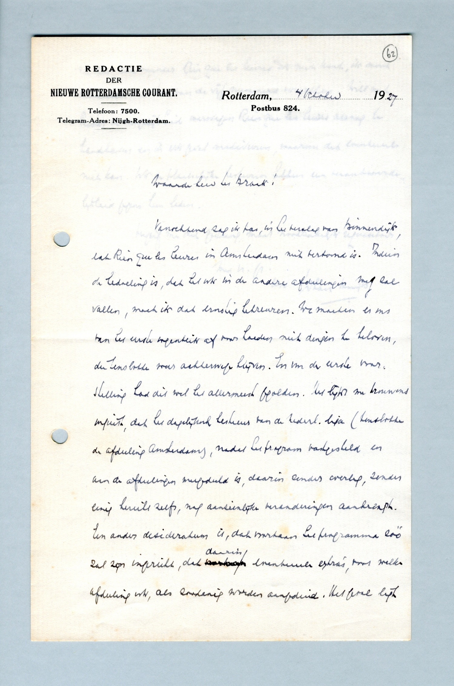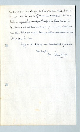Vanochtend zag ik pas, in het verslag van Binnendijk, dat Rien que les heures in Amsterdam niet vertoond is. Indien de bedoeling is, dat het ook in de andere afdeelingen weg zal vallen, moet ik dat ernstig betreuren. We moeten er ons van het eerste oogenblik af voor hoeden niet dingen te beloven, die tenslotte weer achterwege blijven. En voor de eerste voorstelling had dit wel het allermeest gegolden. Het lijkt me trouwens onjuist, dat het dagelijksch bestuur van de Nederl. liga (tenslotte de afdeeling Amsterdam), nadat het program vastgesteld en aan de afdeelingen meegedeeld is, daarin zonder overleg, zonder eenig bericht zelfs, nog aanzienlijke veranderingen aanbrengt. Een ander desideratum is, dat voortaan het programma zóó zal zijn ingericht, dat daarin eventueele extra's, voor welke afdeeling ook, als zoodanig worden aangeduid. Het geval ligt nu zoo, dat wanneer Rien que les heures ook niet komt, ik moet meedeelen dat twee van de vijf nummers vervallen. Wilt met Pelster de mogelijkheid overwegen Rien que les heures alsnog te handhaven en in elk geval motiveeren, waarom dat eventueel niet kan. Want de plaatselijke besturen hebben een verantwoordelijkheid jegens hun leden.