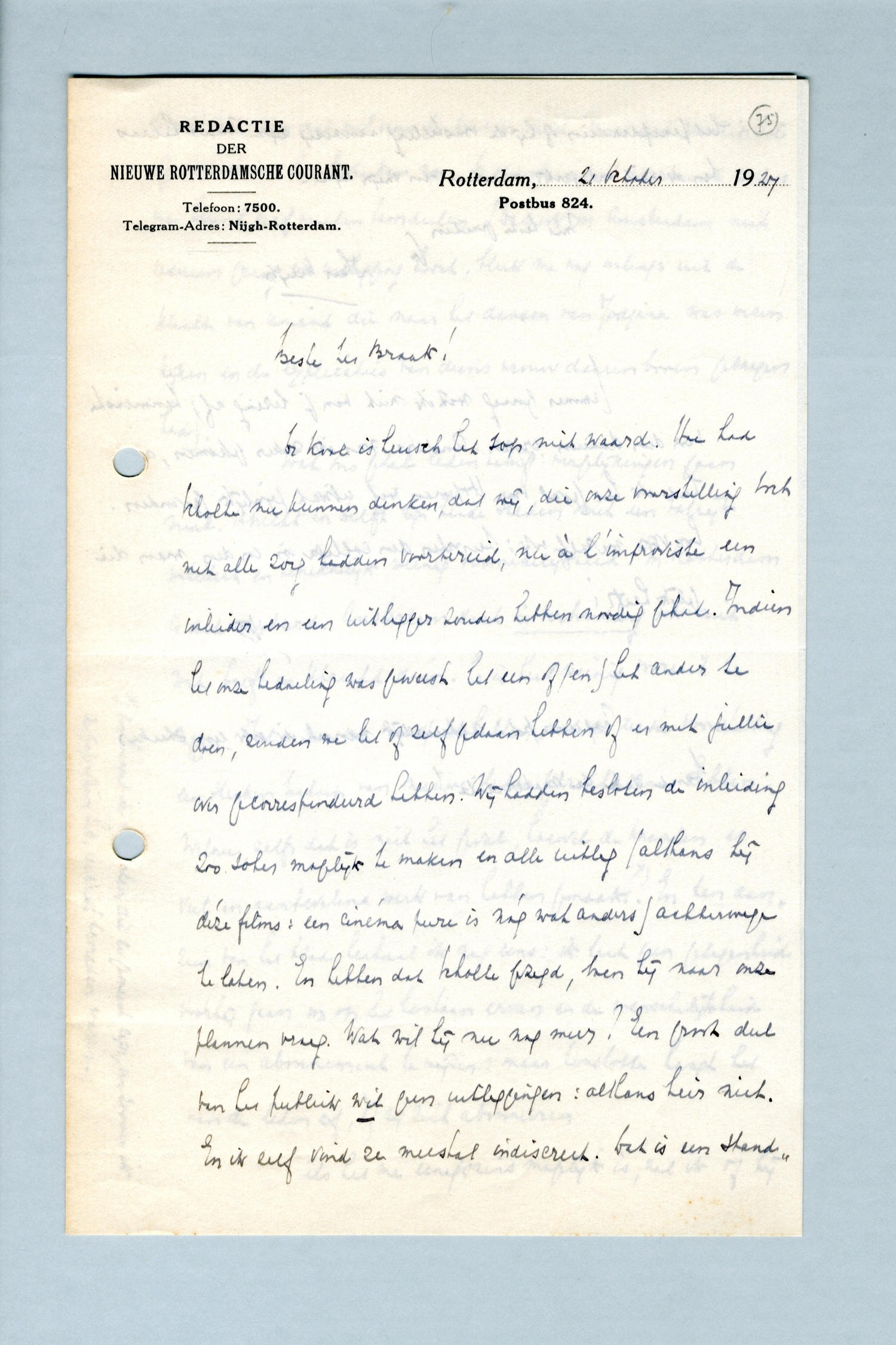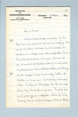 De kool is heusch het sop niet waard. Hoe had Scholte nu kunnen denken, dat wij, die onze voorstelling toch met alle zorg hadden voorbereid, nu à l'improviste een inleider en een uitlegger zouden hebben noodig gehad. Indien het onze bedoeling was geweest het een of (en) het ander te doen, zouden we het of zelf gedaan hebben of er met jullie over gecorrespondeerd hebben. Wij hadden besloten de inleiding zoo sober mogelijk te maken en alle uitleg (althans bij déze films: een cinéma pure is nóg wat anders) achterwege te laten. En hebben dat Scholte gezegd, toen hij naar onze plannen vroeg. Wat wil hij nu nog meer? Een groot deel van het publiek wil geen uitleggingen: althans hier niet. En ik zelf vind ze meestal indiscreet. Dat is een standpunt, waarover nog wel eens te praten valt, maar dat principieel of opportuun het beste kan zijn. De opportuniteit allermeest zullen we heusch zelf moeten beoordeelen. (Dat ook in Amsterdam niet iedereen graag een uitlegging hoort, bleek me nog onlangs uit de klacht van iemand die naar het dansen van Jodjana was wezen kijken en de explicaties van diens vrouw daarenboven gekregen had).