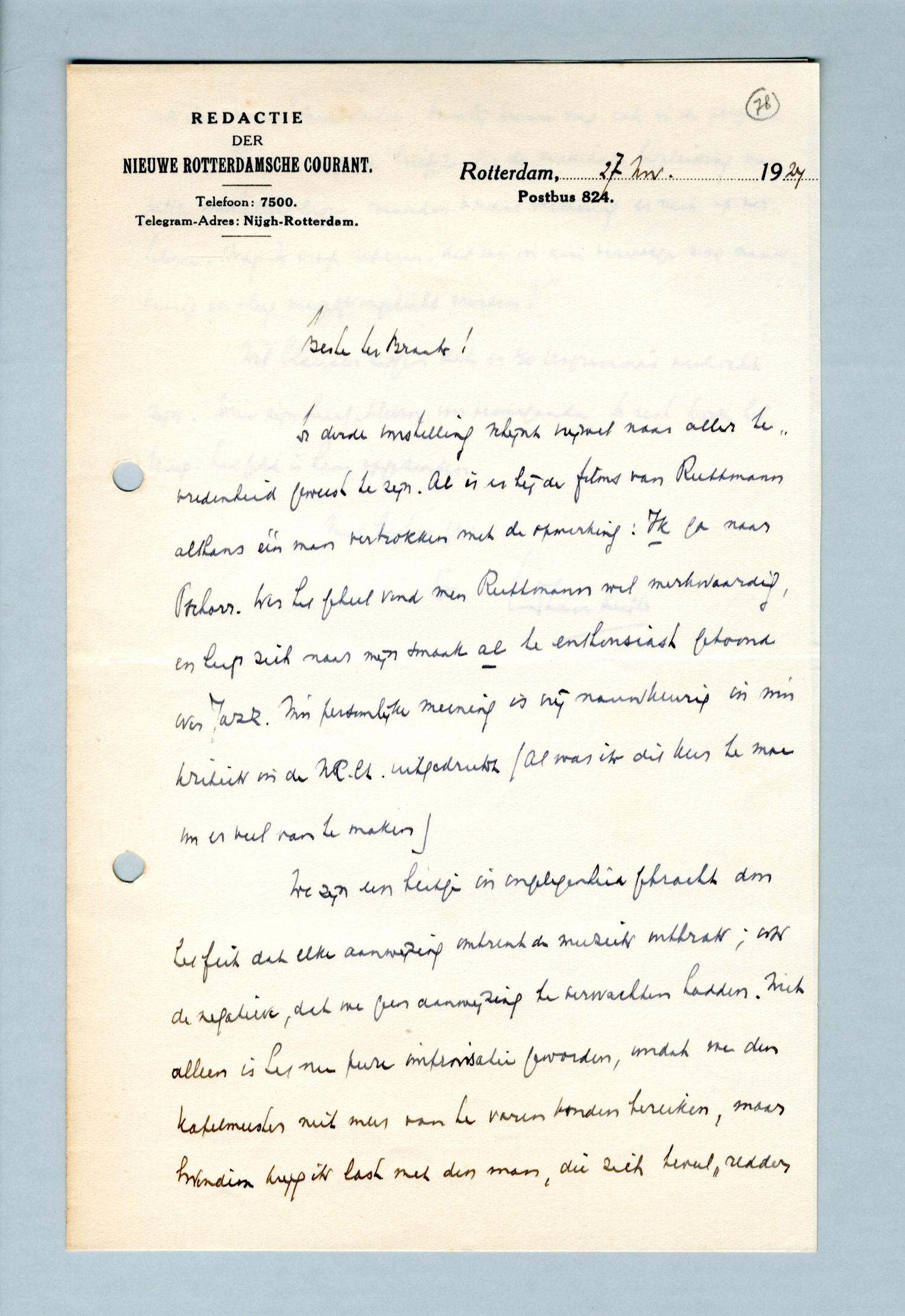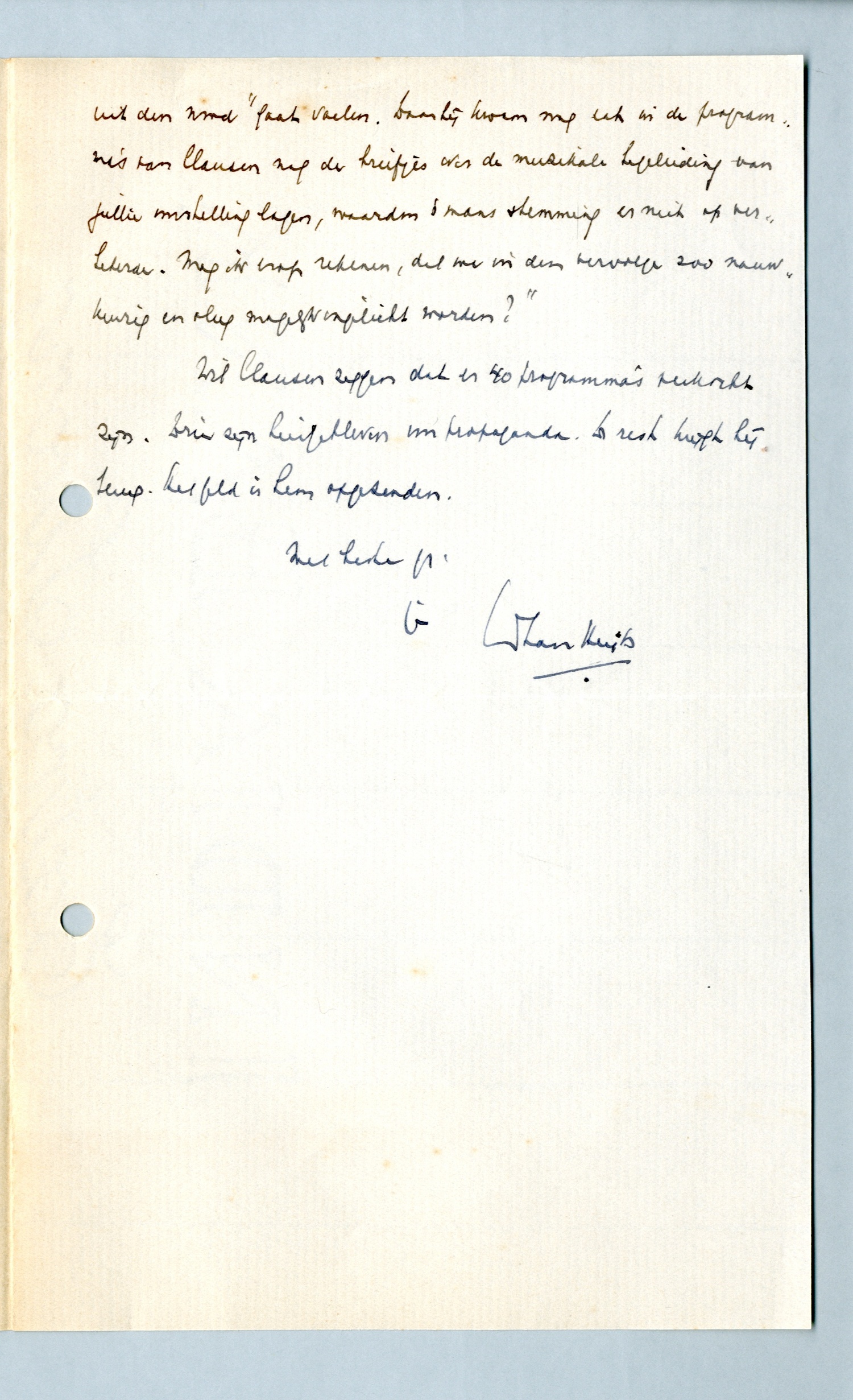 We zijn een beetje in ongelegenheid gebracht door het feit dat elke aanwijzing omtrent de muziek ontbrak; ook de negatieve, dat we geen aanwijzing te verwachten hadden. Niet alleen is het nu pure improvisatie geworden, omdat we den kapelmeester niet meer van te voren konden bereiken, maar bovendien krijg ik last met den man, die zich teveel ‘redder uit den nood’ gaat voelen. Daarbij kwam nog dat in de programma's van Clausen nog de briefjes over de muzikale begeleiding van jullie voorstelling lagen, waardoor 's mans stemming er niet op verbeterde. Mag ik erop rekenen, dat we in den vervolge zoo nauwkeurig en vlug mogelijk ingelicht worden?
