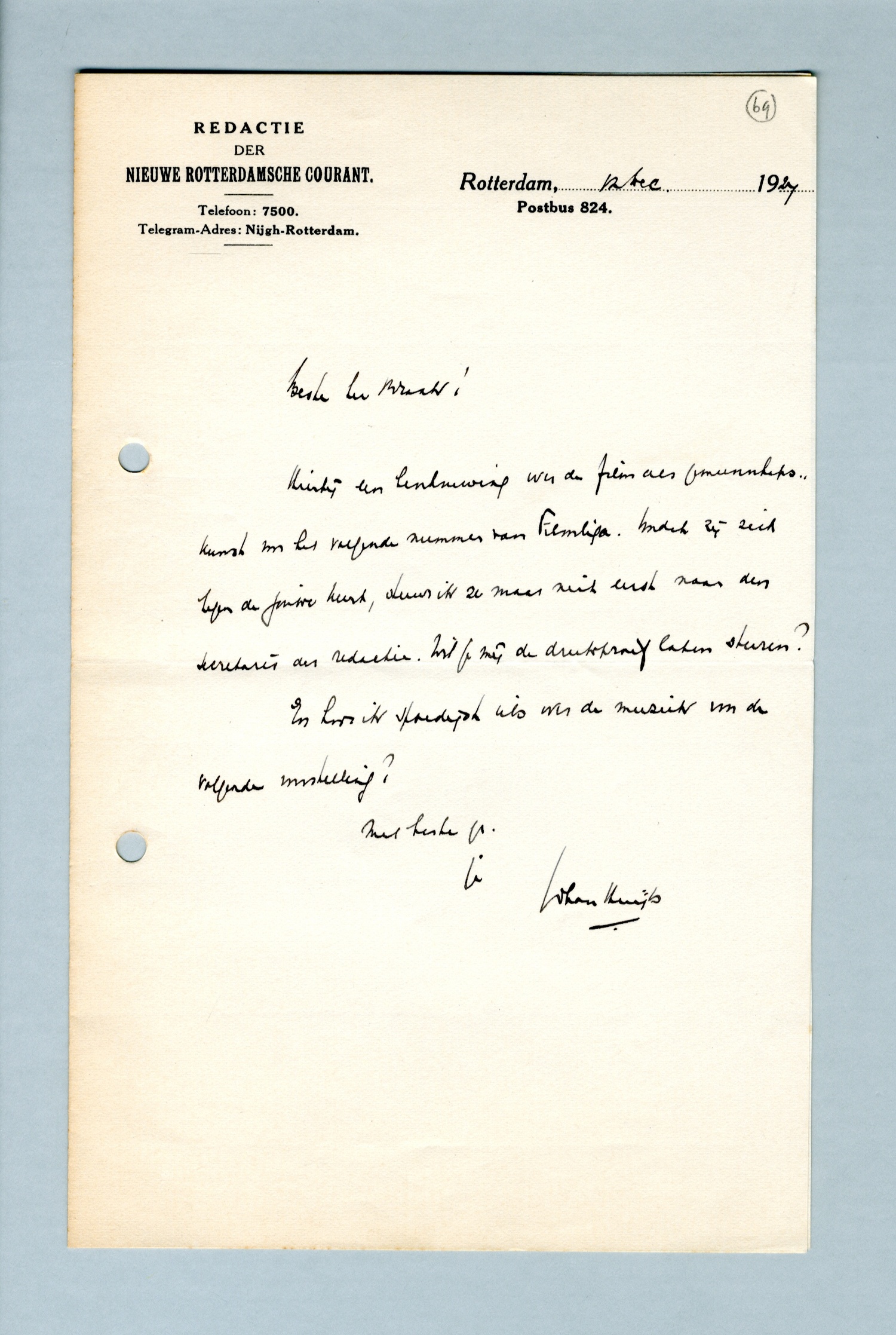 Hierbij een beschouwing over de film als gemeenschapskunst voor het volgende nummer van Filmliga. Omdat zij zich tegen de jouwe keert, stuur ik ze maar niet eerst naar den secretaris der redactie. Wil je mij de drukproef laten sturen?