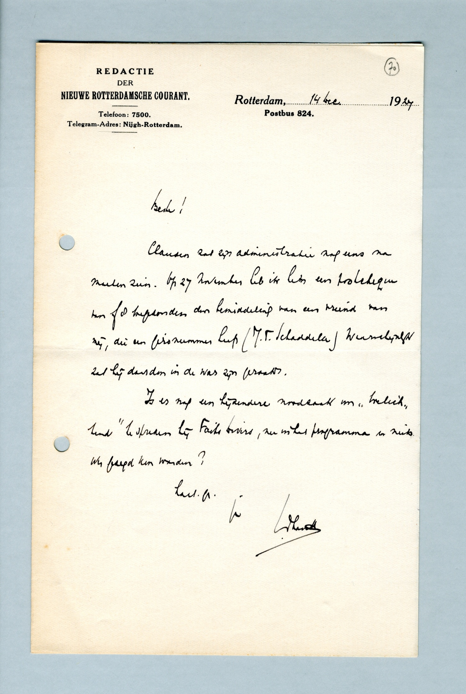 Clausen zal zijn administratie nog eens na moeten zien. Op 27 November heb ik hem een postcheque toegezonden door bemiddeling van een vriend van mij, die een gironummer heeft (J.T. Schadelee). Waarschijnlijk zal hij daardoor in de war zijn geraakt.