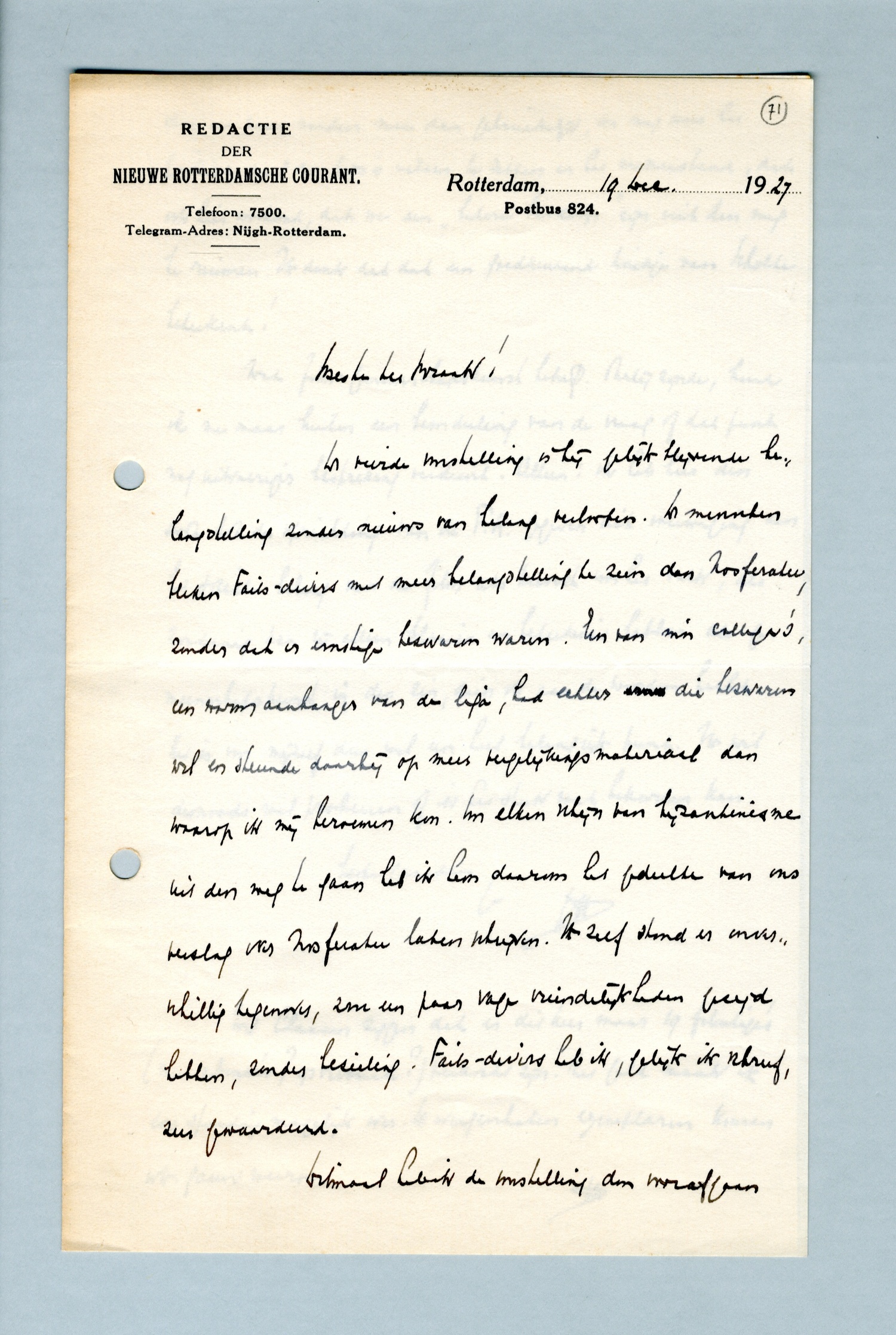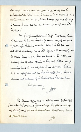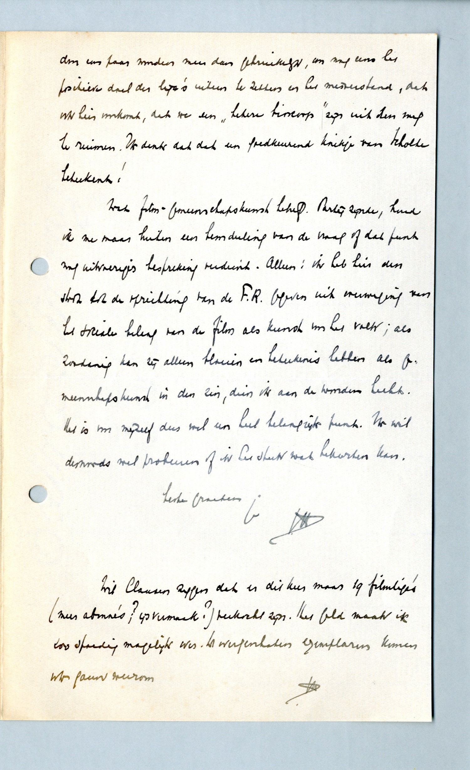 Wat film-gemeenschapskunst betreft. Partij zijnde, houd ik me maar buiten een beoordeeling van de vraag of dat punt nog uitvoeriger bespreking verdient. Alleen: ik heb hier den stoot tot de oprichting van de F.R. gegeven uit overweging van het sociale belang van de film als kunst voor het volk; als zoodanig kan zij alleen bloeien en beteekenis hebben als gemeenschapskunst in den zin, dien ik aan de woorden hecht. Het is voor mijzelf dus wel een heel belangrijk punt. Ik wil desnoods wel probeeren of ik het stuk wat bekorten kan.