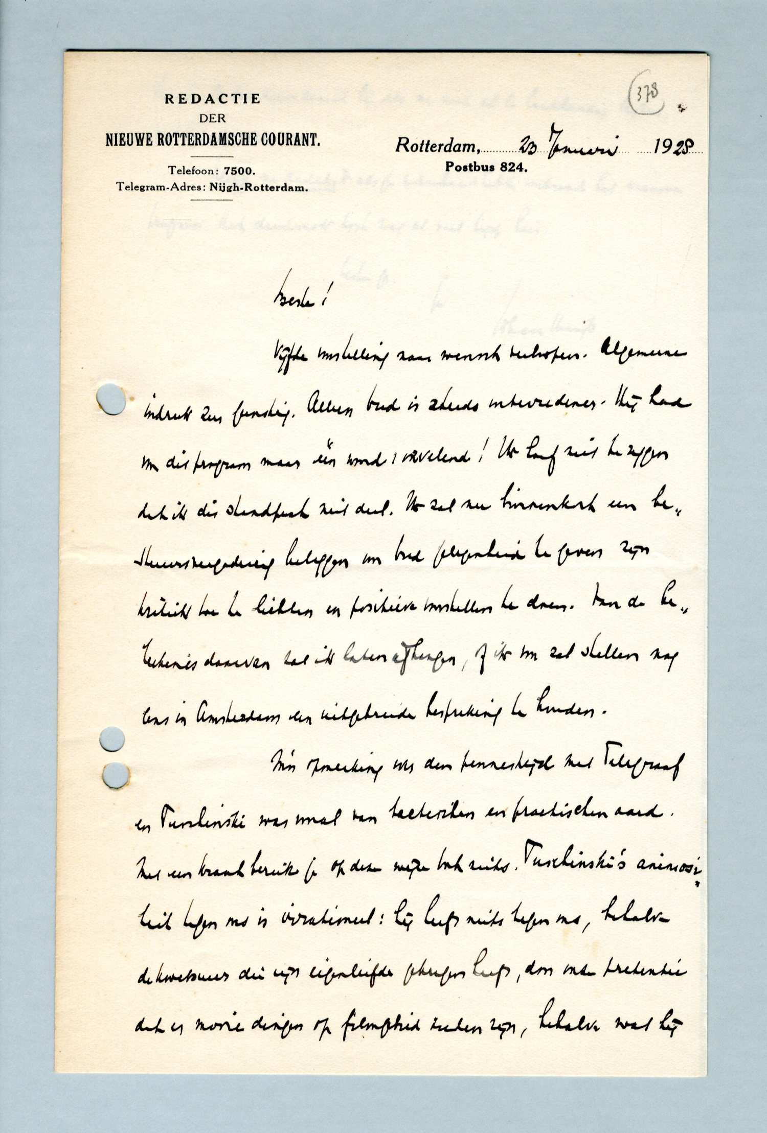 M'n opmerking over den pennestrijd met Telegraaf en Tuschinski was vooral van tactischen en practischen aard. Met een krant bereik je op deze wijze toch niets. Tuschinski's animositeit tegen ons is irrationeel: hij heeft niets tegen ons, behalve de kwetsuur die zijn eigenliefde gekregen heeft, door onze pretentie dat er mooie dingen op filmgebied zouden zijn, behalve wat hij brengt. Op den duur draait hij, als we niet al te hardhandig blijken, wel bij, dunkt me.