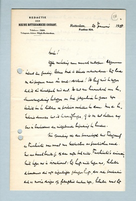 Vijfde voorstelling naar wensch verloopen. Algemeene indruk zeer gunstig. Alleen Oud is steeds ontevredener. Hij had voor dit programma maar één woord: vervelend! Ik hoef niet te zeggen dat ik dit standpunt niet deel. Ik zal nu binnenkort een bestuursvergadering beleggen om Oud gelegenheid te geven zijn kritiek toe te lichten en positieve voorstellen te doen. Van de beteekenis daarvan zal ik laten afhangen, of ik voor zal stellen nog eens in Amsterdam een uitgebreide bespreking te houden.