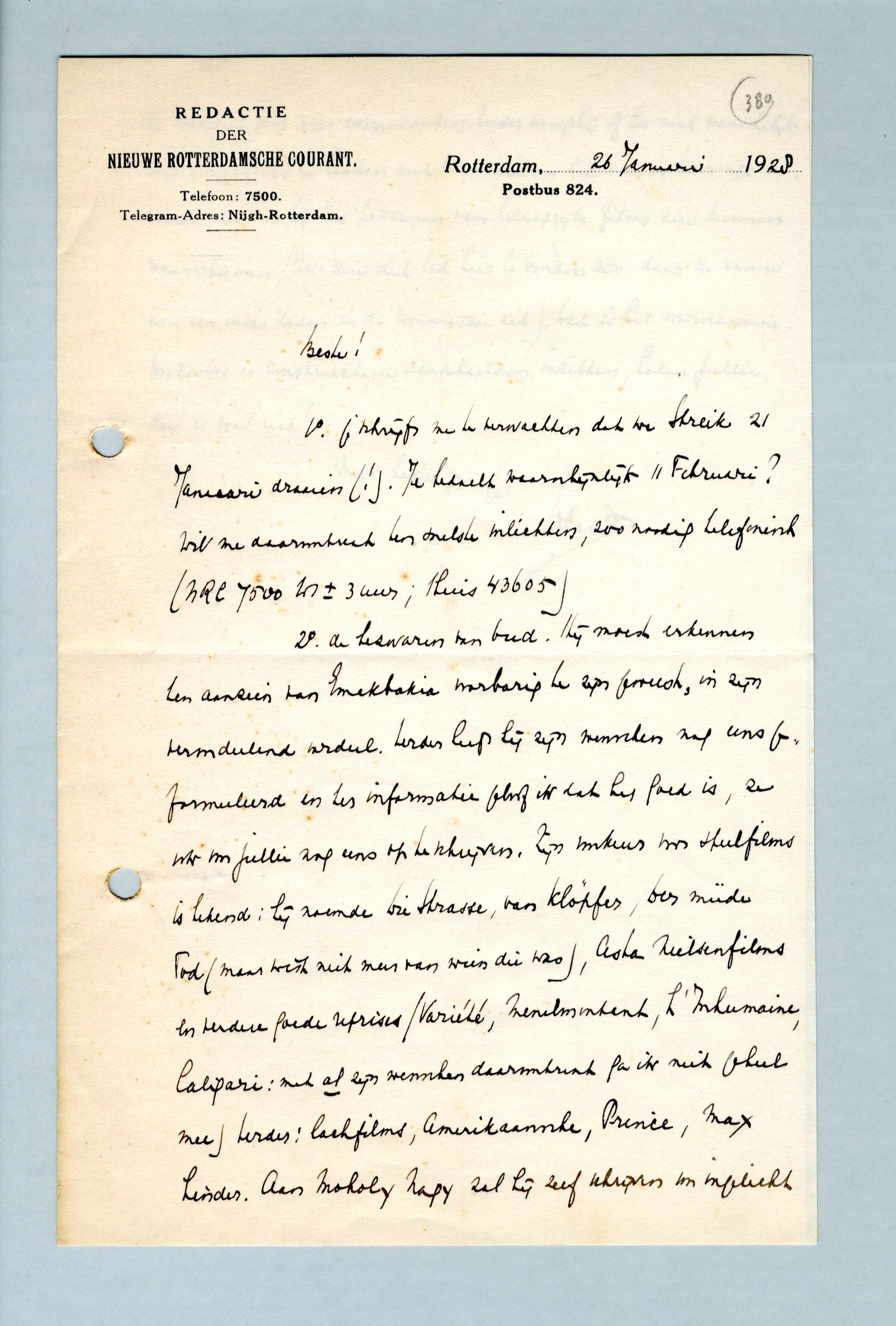 1o. je schrijft me te verwachten dat we Streik 21 Januari draaien (!). Je bedoelt waarschijnlijk 11 Februari? Wil me daaromtrent ten snelste inlichten, zoo noodig telefonisch (NRC 7500 tot ± 3 uur; thuis 43605).