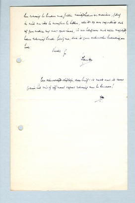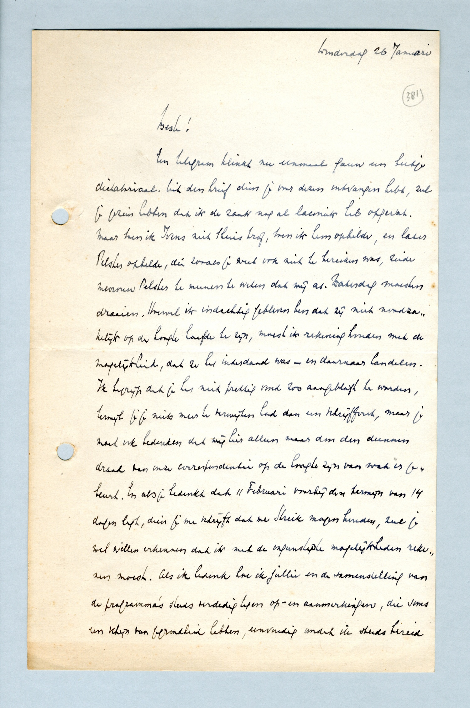 Een telegram klinkt nu eenmaal gauw een beetje dictatoriaal. Uit den brief dien je voor dezen ontvangen hebt, zul je gezien hebben dat ik de zaak nog al laconiek heb opgevat. Maar toen ik Ivens niet thuis trof, toen ik hem opbelde, en later Pelster opbelde, die zooals je weet ook niet te bereiken was, zeide mevrouw Pelster te meenen te weten dat wij as. Zaterdag moesten draaien. Hoewel ik indachtig gebleven ben dat zij niet noodzakelijk op de hoogte hoefde te zijn, moest ik rekening houden met de mogelijkheid, dat ze het inderdaad was - en daarnaar handelen. Ik begrijp dat je het niet prettig vond zoo aangeblaft te worden, terwijl je je niets meer te verwijten had dan een schrijffout, maar je moet ook bedenken dat wij hier alleen maar door den dunnen draad van onze correspondentie op de hoogte zijn van wat er gebeurt. En als je bedenkt dat 11 Februari voorbij den termijn van 14 dagen ligt, dien je me schrijft dat we Streik mogen houden, zul je wel willen erkennen dat ik met de ongunstigste mogelijkheden rekening houden moest. Als ik bedenk hoe ik jullie en de samenstelling van de programma's steeds verdedig tegen op- en aanmerkingen, die soms een schijn van gegrondheid hebben, eenvoudig omdat ik steeds bereid ben rekening te houden met jullie moeilijkheden en moeiten, geloof ik niet me iets te verwijten te hebben, als ik op een oogenblik dat mij geen andere weg meer openstaat, in een telegram met alle mogelijkheden rekening houd. Geloof me, dat ik geen onheusche bedoelingen had.