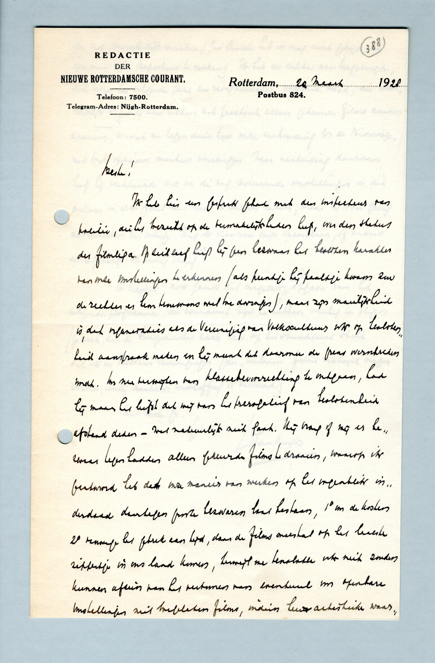 Ik heb hier een gesprek gehad met den inspecteur van politie, die het toezicht op de vermakelijkheden heeft, over den status der filmliga. Op zichzelf heeft hij geen bezwaar het besloten karakter van onze voorstellingen te erkennen (als puntje bij paaltje kwam zou de rechter er hem trouwens wel toe dwingen), maar zijn moeilijkheid is, dat organisaties als de Vereeniging voor Volkscultuur ook op beslotenheid aanspraak maken en hij meent dat daarmee de grens overschreden wordt. Om nu verwijten van klassebevoorrechting te ontgaan, had hij maar het liefst dat wij van het prerogatief van beslotenheid afstand deden - wat natuurlijk niet gaat. Hij vroeg of wij er bezwaar tegen hadden alleen gekeurde films te draaien, waarop ik geantwoord heb dat onze manier van werken op het oogenblik inderdaad daartegen groote bezwaren laat bestaan, 1e voor de kosten 2e vanwege het gebrek aan tijd, daar de films meestal op het laatste nippertje in ons land komen, terwijl we tenslotte ook niet zouden kunnen afzien van het vertoonen van eventueel voor openbare voorstellingen niet toegelaten films, indien hun artistieke waarde dat wenschelijk maakte. (Het laatste heb ik nog niet gezegd, om den man niet kopschuw te maken). Ik heb er echter aan toegevoegd, dat tegen het volgende jaar een reorganisatie voorbereid werd, die waarschijnlijk tot gevolg zou hebben dat practisch alleen gekeurde films zouden draaien, zoodat we tegen dien tijd onze verhouding tot de bioscoopwet toch opnieuw moeten overwegen. Naar aanleiding daarvan heeft hij verklaard ons voor de nog resteerende voorstellingen in dit seizoen in elk geval met rust te zullen laten, maar hij wou graag de statuten ter inzage. Mag ik daarom mijn exemplaar, of anders een afschrift, spoedig terug?