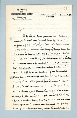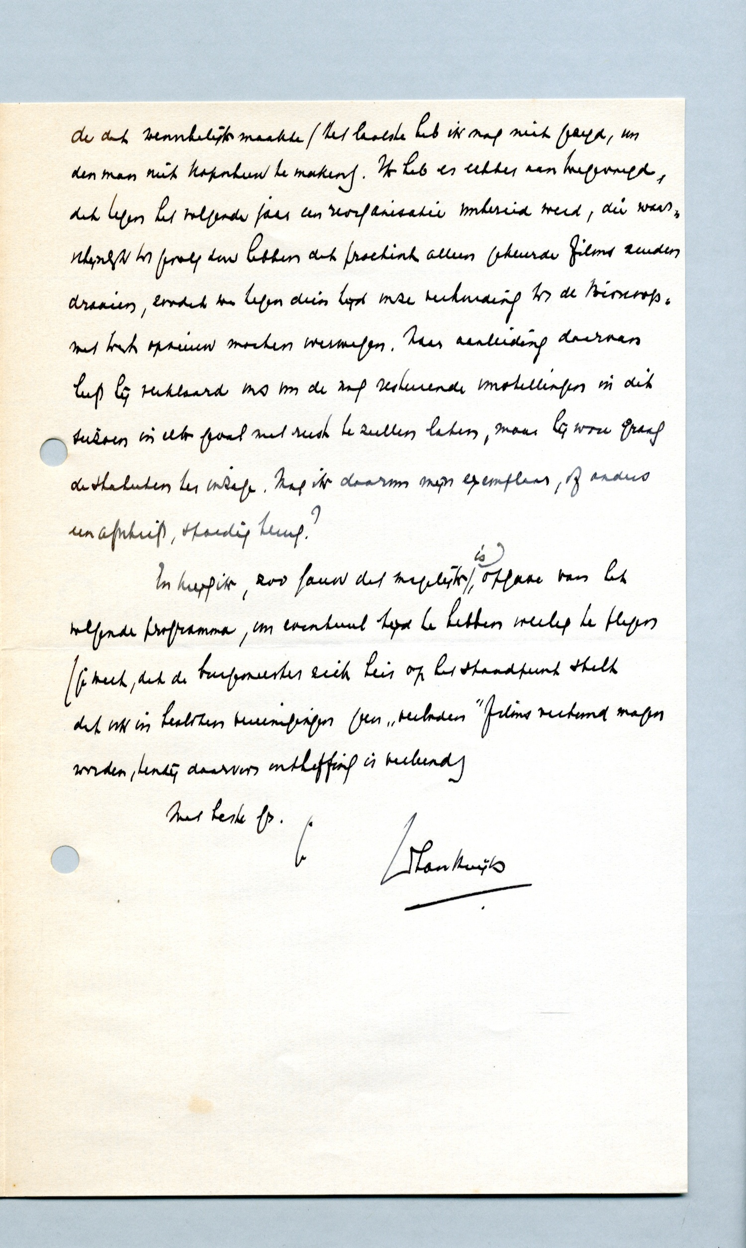 En krijg ik, zoo gauw dat mogelijk is, opgave van het volgende programma, om eventueel tijd te hebben overleg te plegen (je weet, dat de burgemeester zich hier op het standpunt stelt dat ook in besloten vereenigingen geen ‘verboden’ films vertoond mogen worden, tenzij daarvoor ontheffing is verleend).