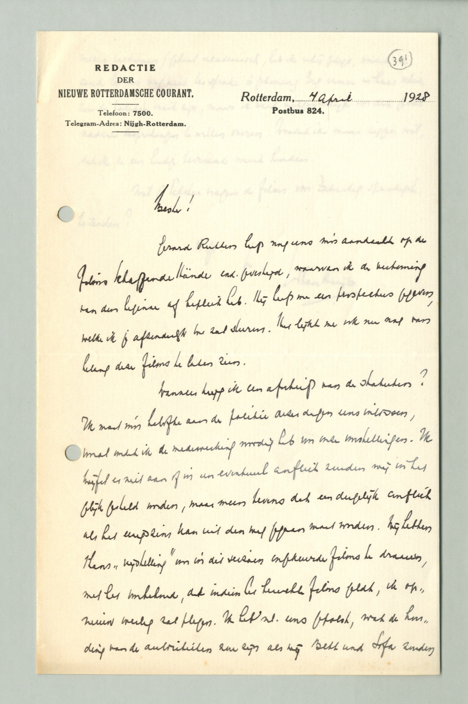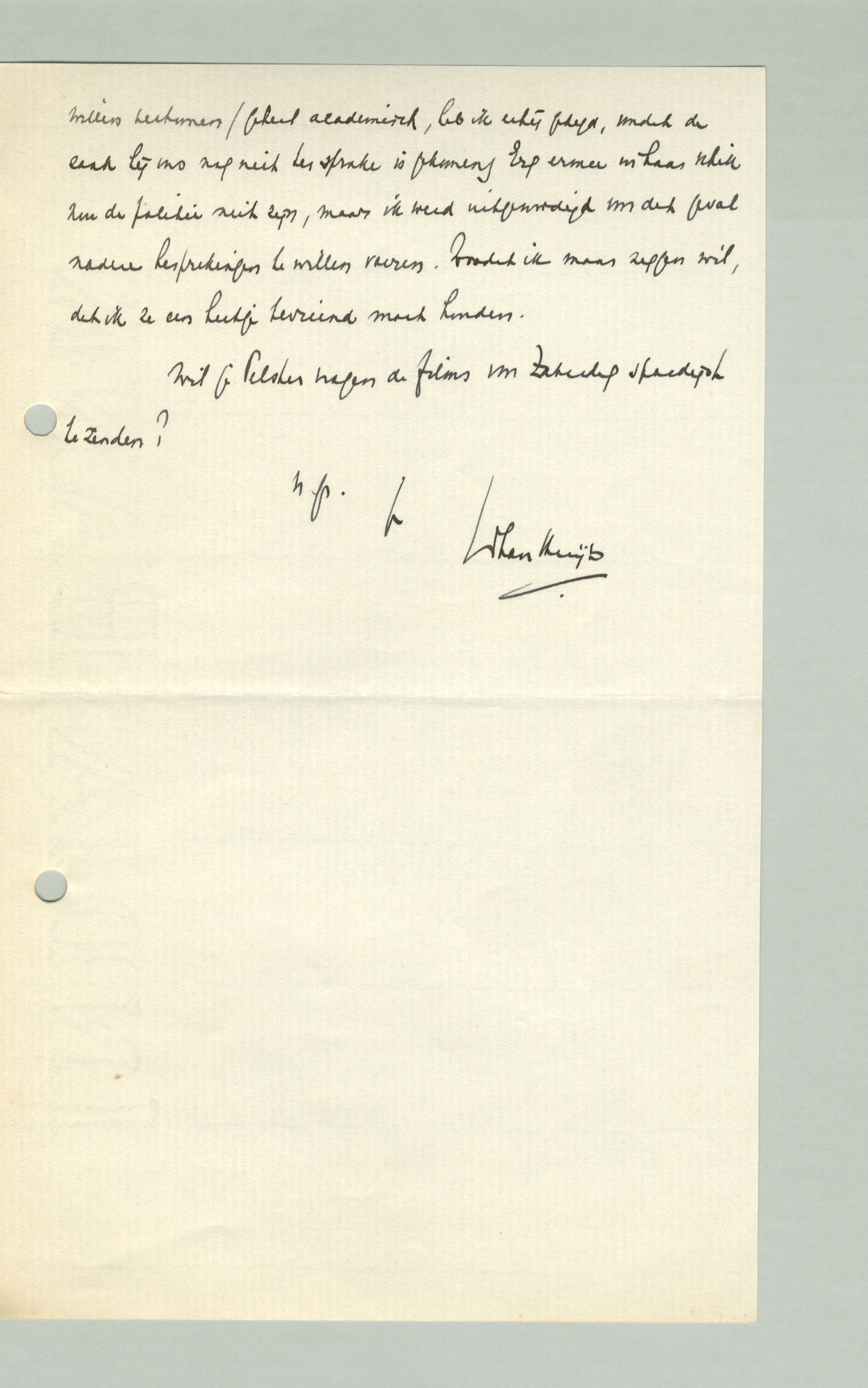 Gerard Rutten heeft nog eens m'n aandacht op de films [onleesbaar] gevestigd, waarvan ik de vertooning van den beginne af bepleit heb. Hij heeft me een prospectus gegeven, welke ik je afzonderlijk toe zal sturen. Het lijkt me ook nu nog van belang deze films te laten zien.