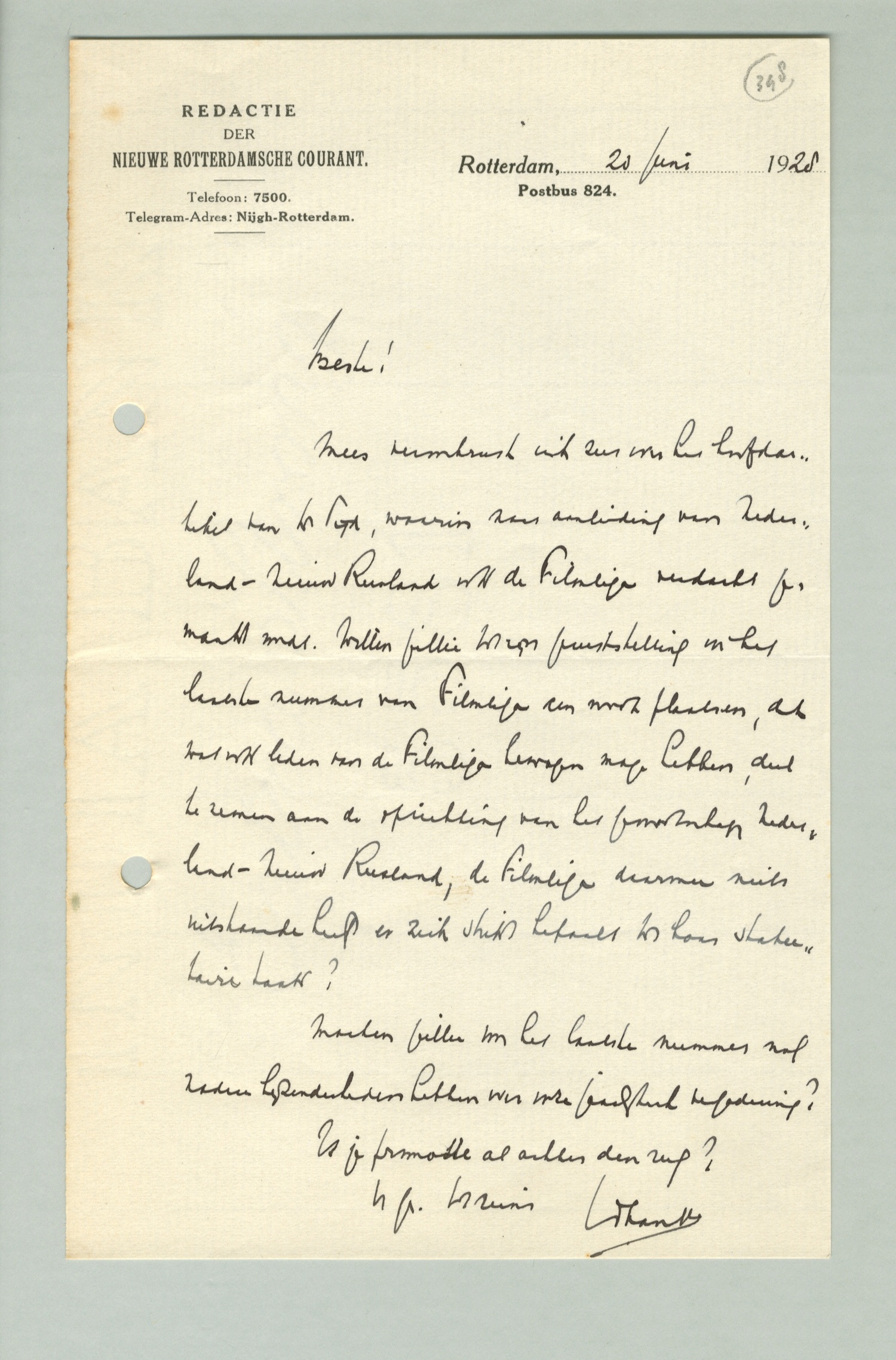 Mees verontrust zich zeer over het hoofdartikel van De Tijd, waarin naar aanleiding van Nederland-Nieuw Rusland [onleesbaar] verdacht gemaakt wordt. Willen jullie tot zijn geruststelling in het komende nummer van Filmliga een noot plaatsen, dat te [onleesbaar] oprichting van het genootschap Nederland-Nieuw Rusland, de Filmliga daarmee niets uitstaande heeft en zich slechts beperkt tot haar [onleesbaar] taak?