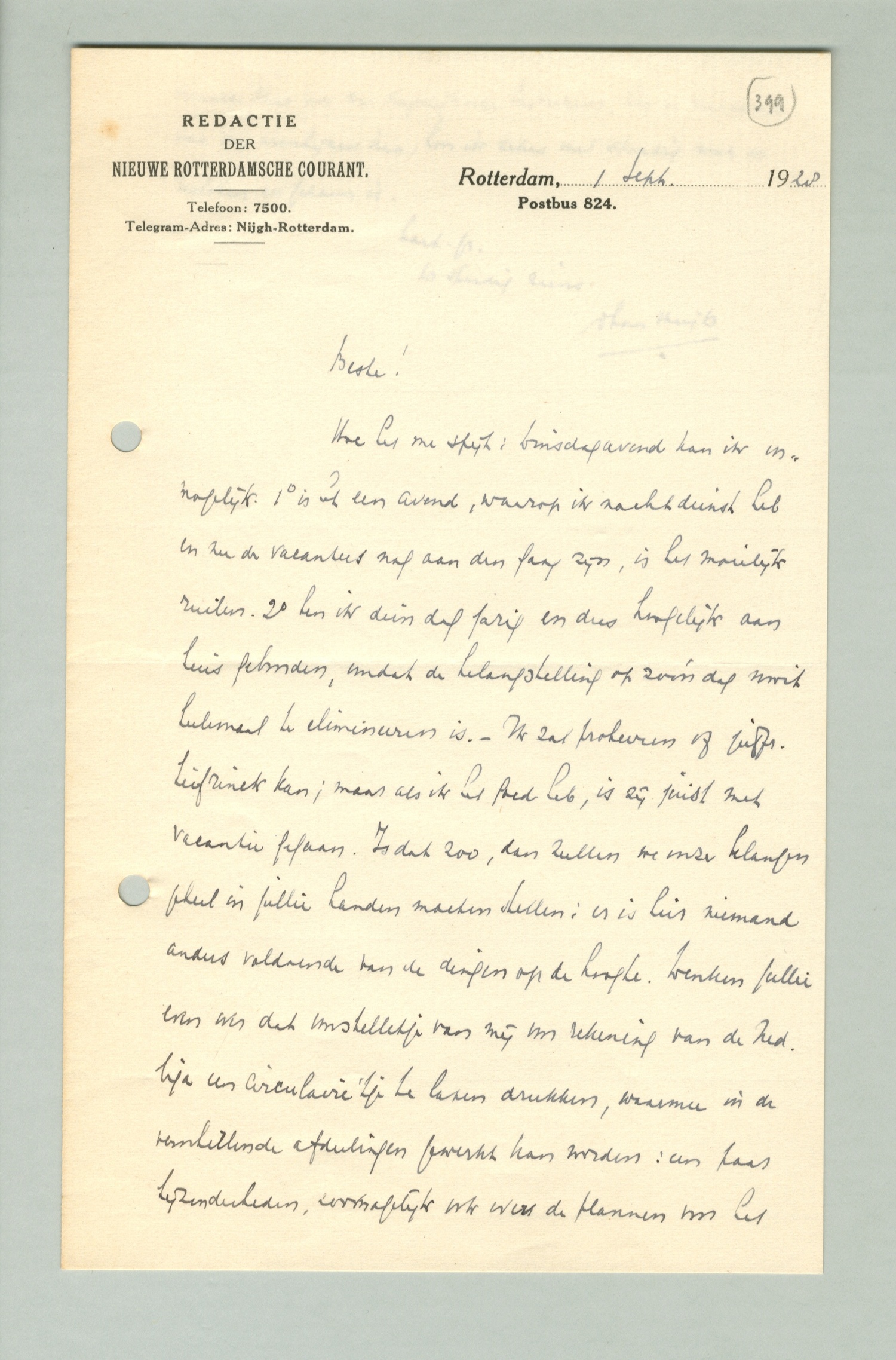 Hoe het me spijt: Dinsdagavond kan ik onmogelijk. 1e is het een avond, waarop ik nachtdienst heb en nu de vacanties nog aan den gang zijn, is het moeilijk ruilen. 2e ben ik dinsdag jarig en dus [onleesbaar] aan huis gebonden, omdat de belangstelling op zoo'n dag nooit heelemaal te elimineeren is. - Ik zal probeeren of juffr. Liefrinck kan; maar als ik het goed heb, is zij juist met vacantie gegaan. Is dat zoo, dan zullen we onze belangen geheel in jullie handen moeten stellen: er is hier niemand anders voldoende van de dingen op de hoogte. Denken jullie even aan dat voorstelletje van mij voor rekening van de Nedliga een circulaire te laten drukken, waarmee in de verschillende afdeelingen gewerkt kan worden: een paar bijzonderheden, zoomogelijk ook over de plannen voor het nieuwe jaar en de dagelijksche besturen. Als er niemand van ons verschijnen kan, hoor ik zeker wel spoedig wat er besloten en gedaan is.