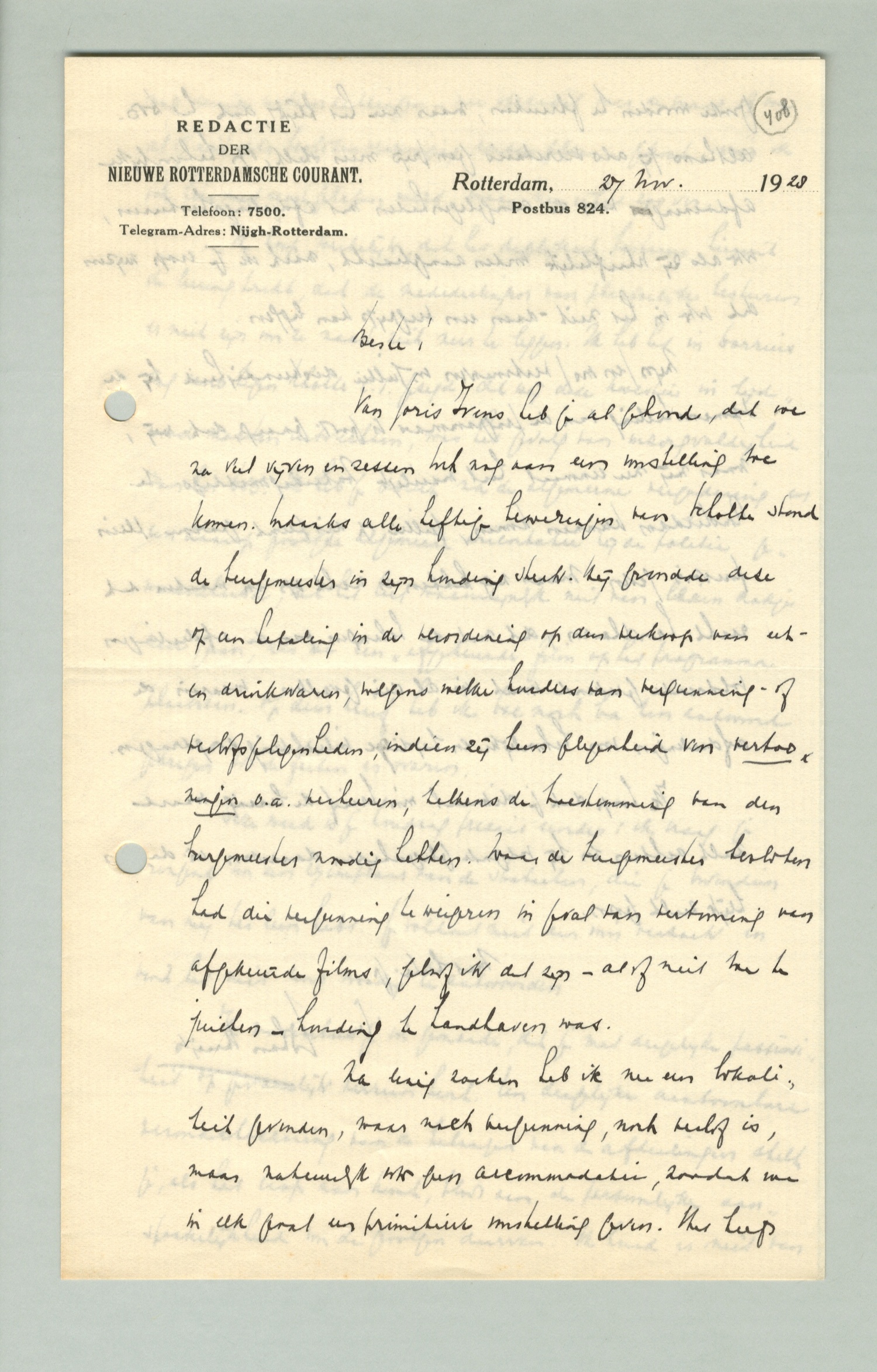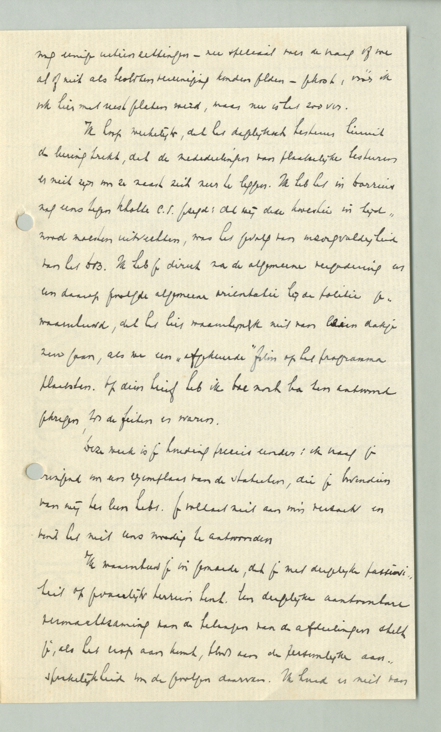 Ik hoop werkelijk, dat het dagelijksch bestuur hieruit de leering trekt, dat de mededeelingen van plaatselijke besturen er niet zijn om ze naast zich neer te leggen. Ik heb het in [onleesbaar] nog eens tegen Scholte c.s. gezegd: dat wij deze kwestie in tijdnood moesten uitvechten, was het gevolg van onzorgvuldigheid van het DB. Ik heb je direct na de algemeene vergadering en een daarop gevolgde algemeene orientatie bij de politie gewaarschuwd, dat het hier waarschijnlijk niet van een leien dakje zou gaan, als we een ‘afgekeurde’ film op het programma plaatsten. Op dien brief heb ik boe noch ba ten antwoord gekregen, tot de feiten er waren.