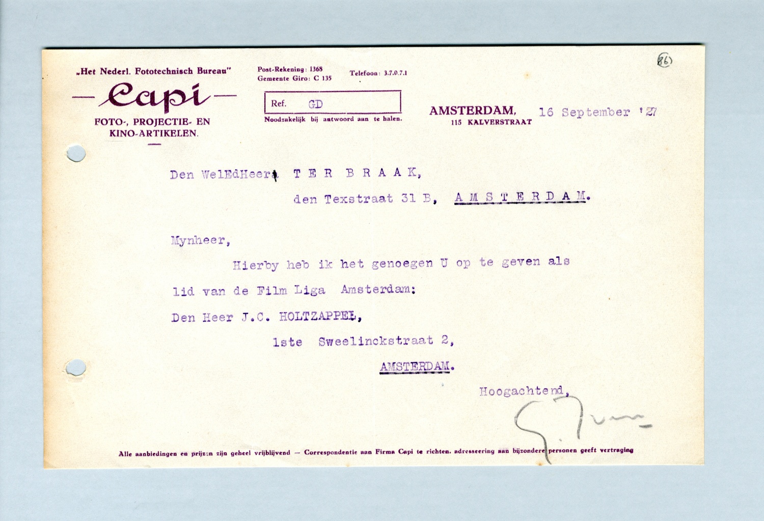Hierbij heb ik het genoegen U op te geven als lid van de Film Liga Amsterdam: