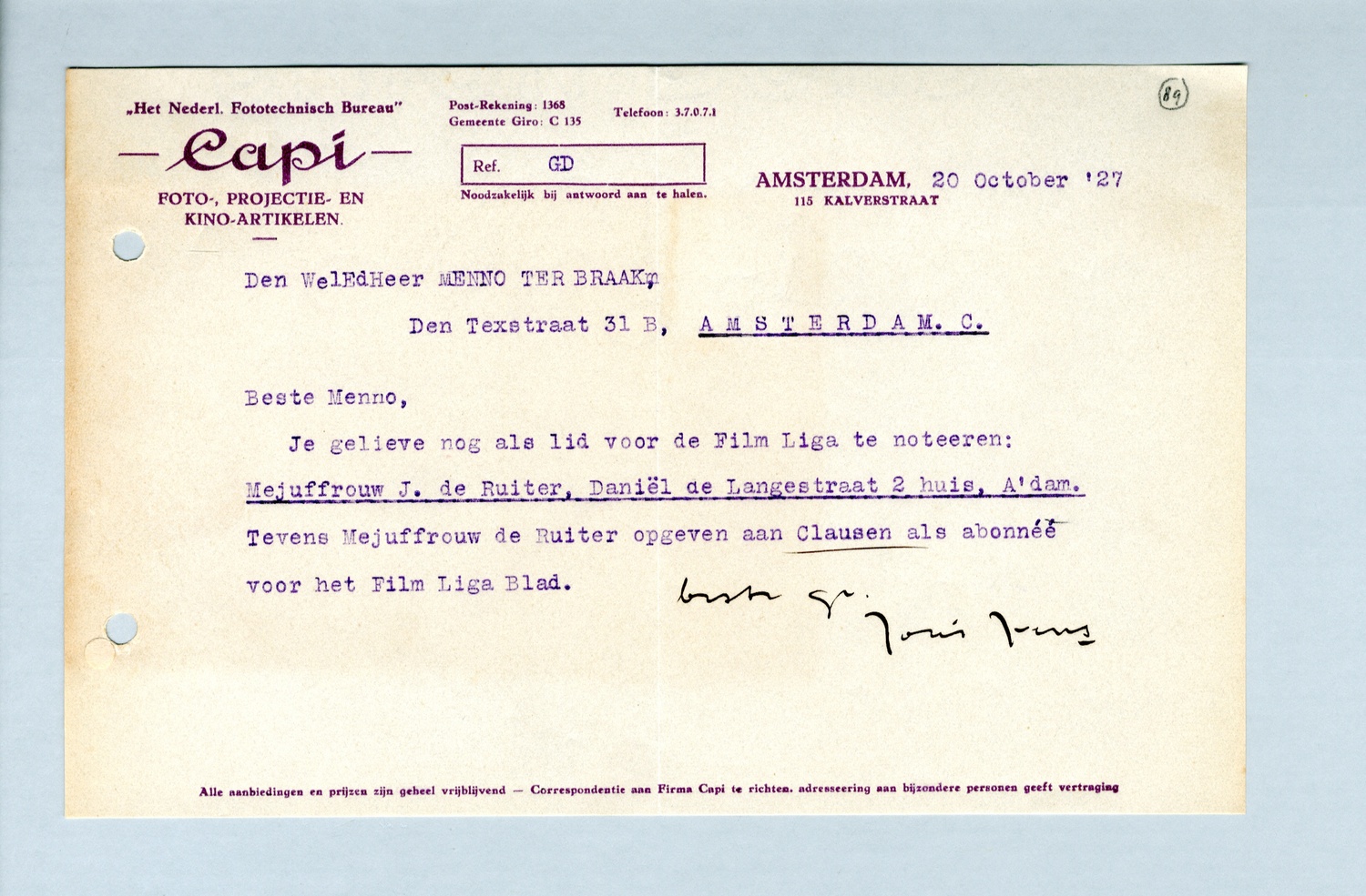 Tevens Mejuffrouw de Ruiter opgeven aan Clausen als abonnée voor het Film Liga Blad.