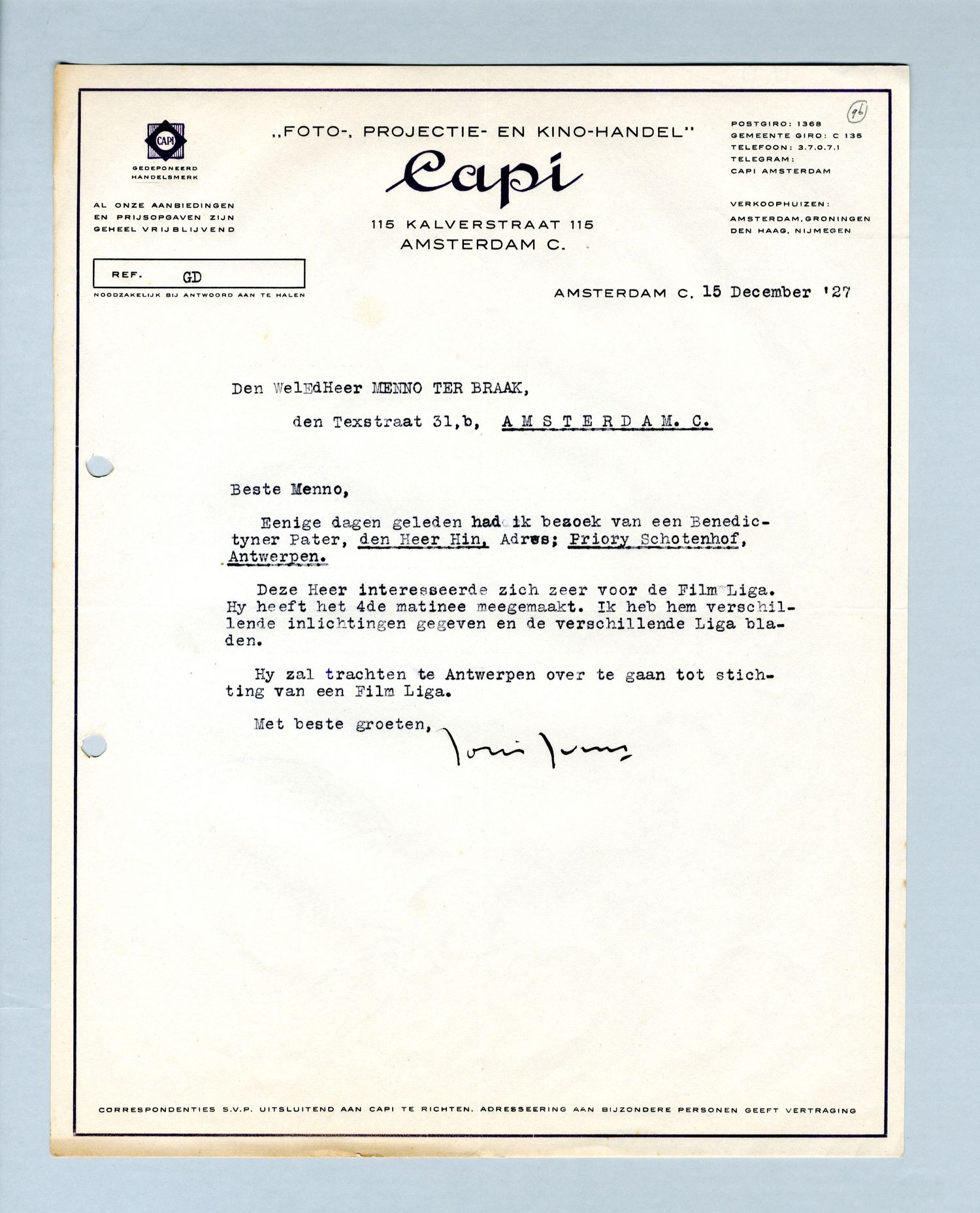 Deze Heer interesseerde zich zeer voor de Film Liga. Hij heeft het 4de matinee meegemaakt. Ik heb hem verschillende inlichtingen gegeven en de verschillende Liga bladen.