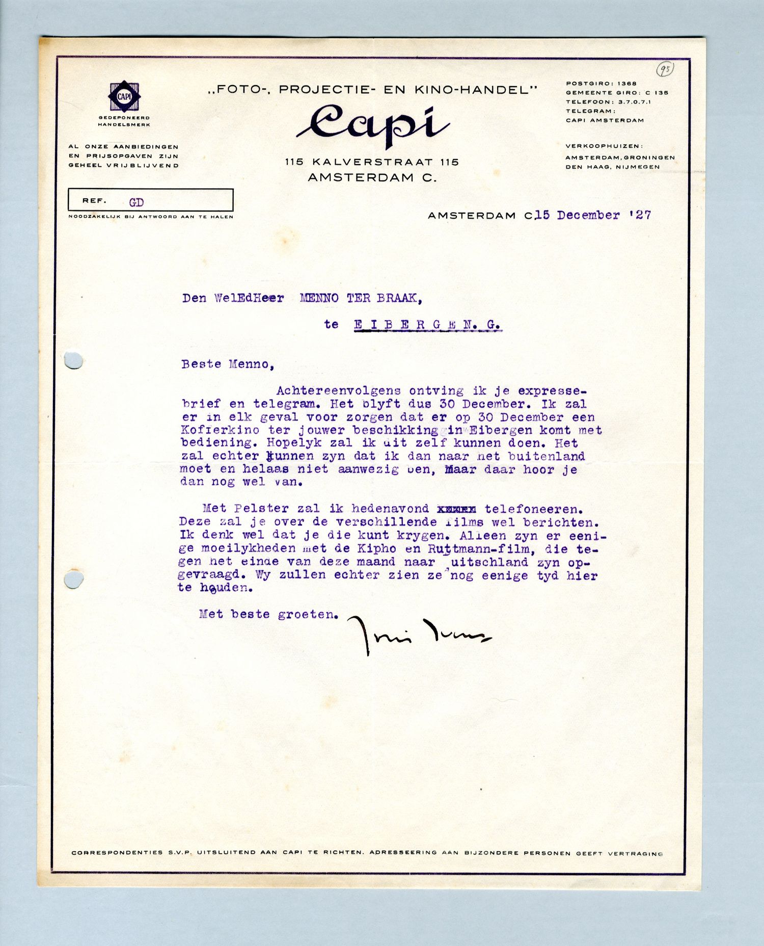 Met Pelster zal ik hedenavond telefoneeren. Deze zal je over de verschillende films wel berichten. Ik denk wel dat je die kunt krijgen. Alleen zijn er eenige moeilijkheden met de Kipho en Ruttmann-film, die tegen het einde van deze maand naar Duitschland zijn opgevraagd. Wij zullen echter zien ze nog eenige tijd hier te houden.