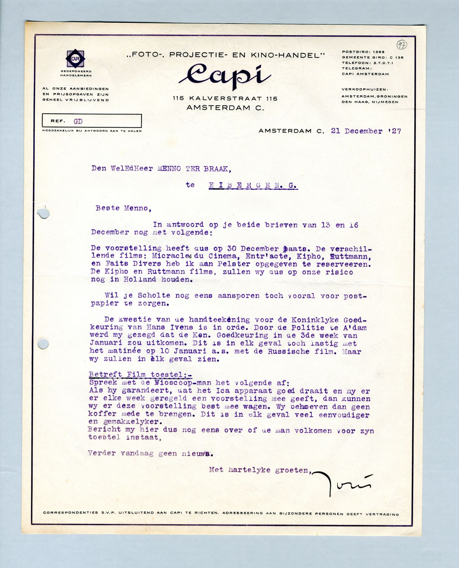 De kwestie van de handteekening voor de Koninlijke Goedkeuring van Hans Ivens is in orde. Door de Politie te A'dam werd mij gezegd dat de Kon. Goedkeuring in de 3de week van Januari zou uitkomen. Dit is in elk geval toch lastig met het matinée op 10 Januari a.s. met de Russische film. Maar wij zullen in elk geval zien.