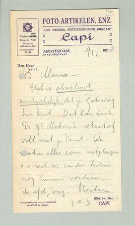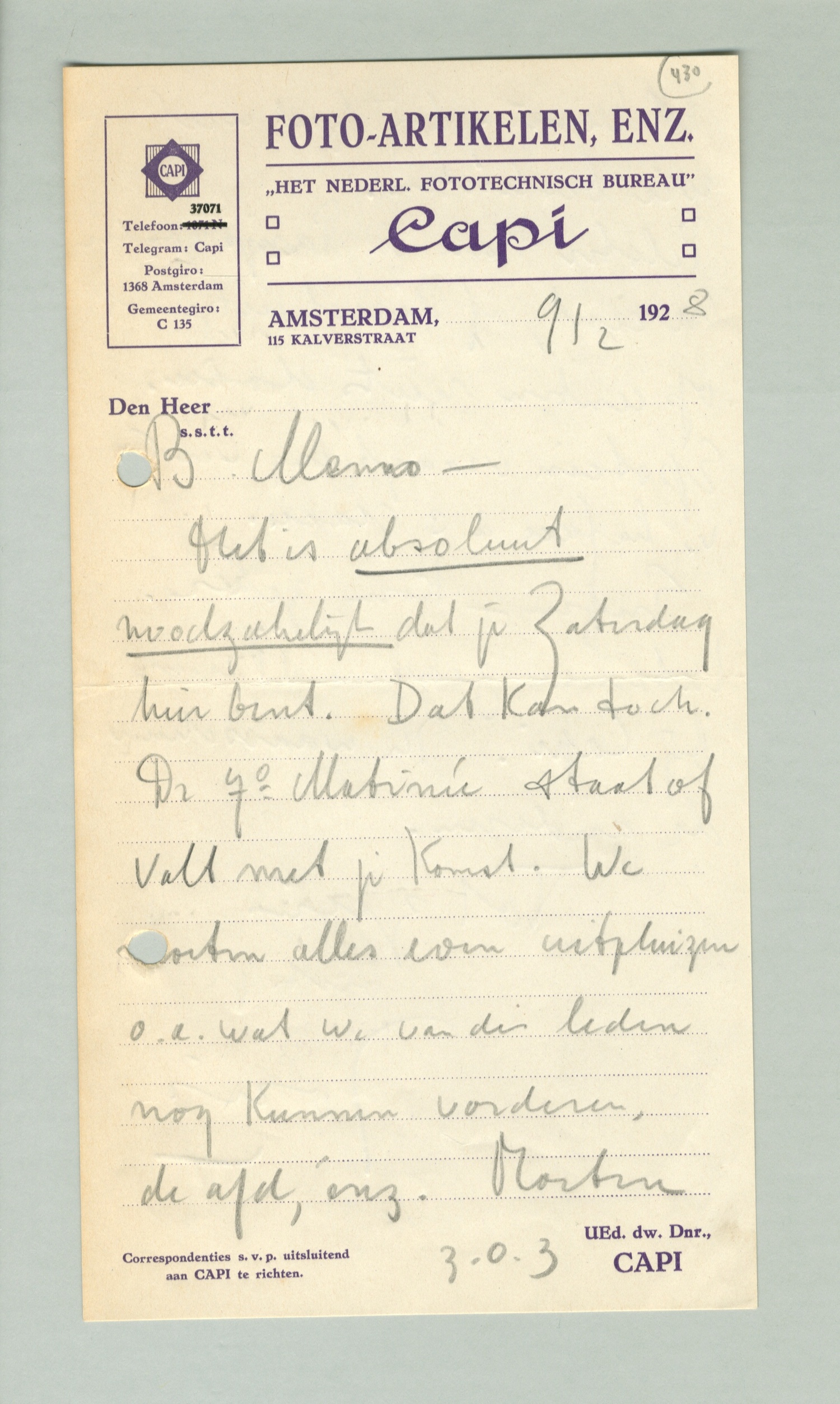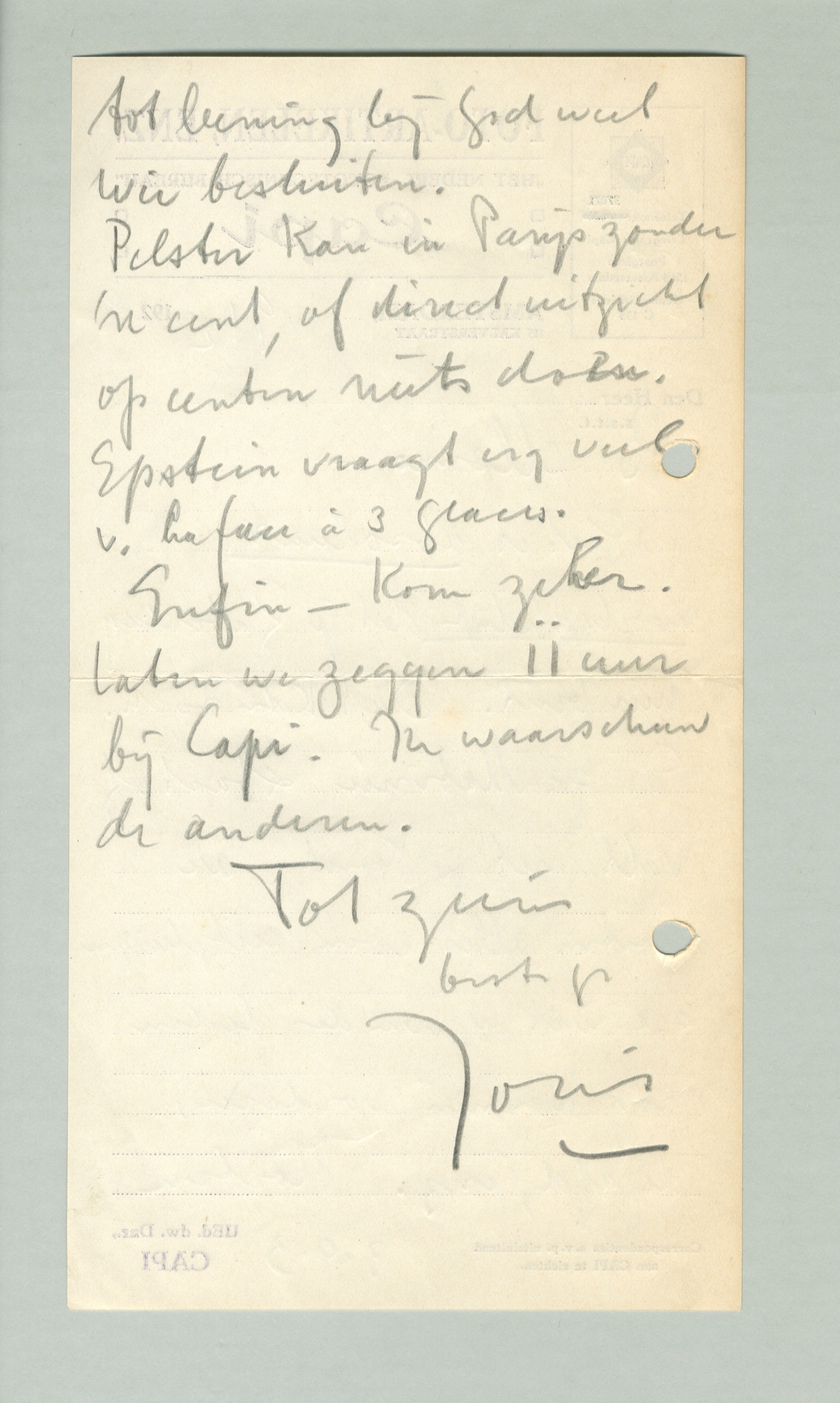 Het is absoluut noodzakelijk dat je Zaterdag hier bent. Dat kan toch. De 7e Matinée staat of valt met je komst. We moeten alles even uitpluizen o.a. wat we van de leden nog kunnen vorderen, de afd, enz. Moeten tot leening bij God weet wie besluiten.