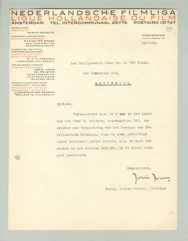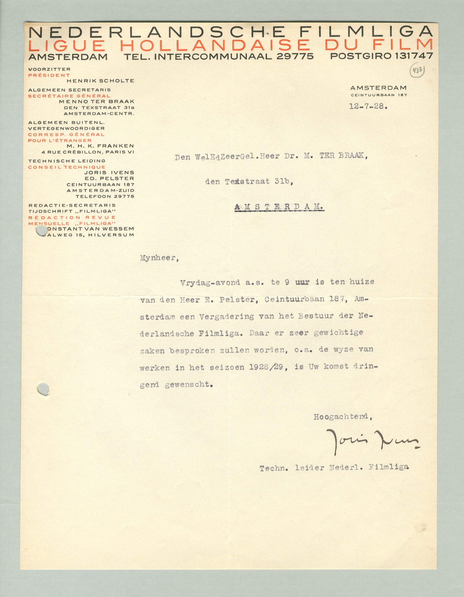 Vrijdag-avond a.s. te 9 uur is ten huize van den Heer E. Pelster, Ceintuurbaan 187, Amsterdam een Vergadering van het Bestuur der Nederlandsche Filmliga. Daar er zeer gewichtige zaken besproken zullen worden, o.a. de wijze van werken in het seizoen 1928/29, is Uw komst dringend gewenscht.