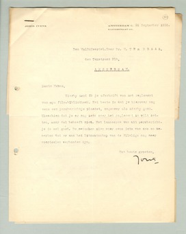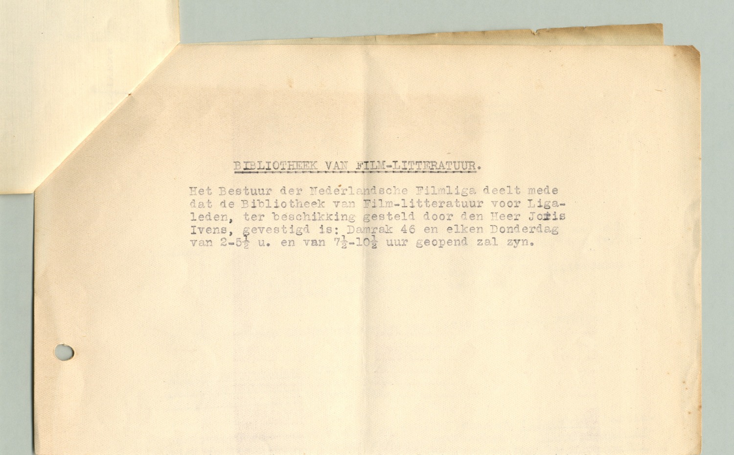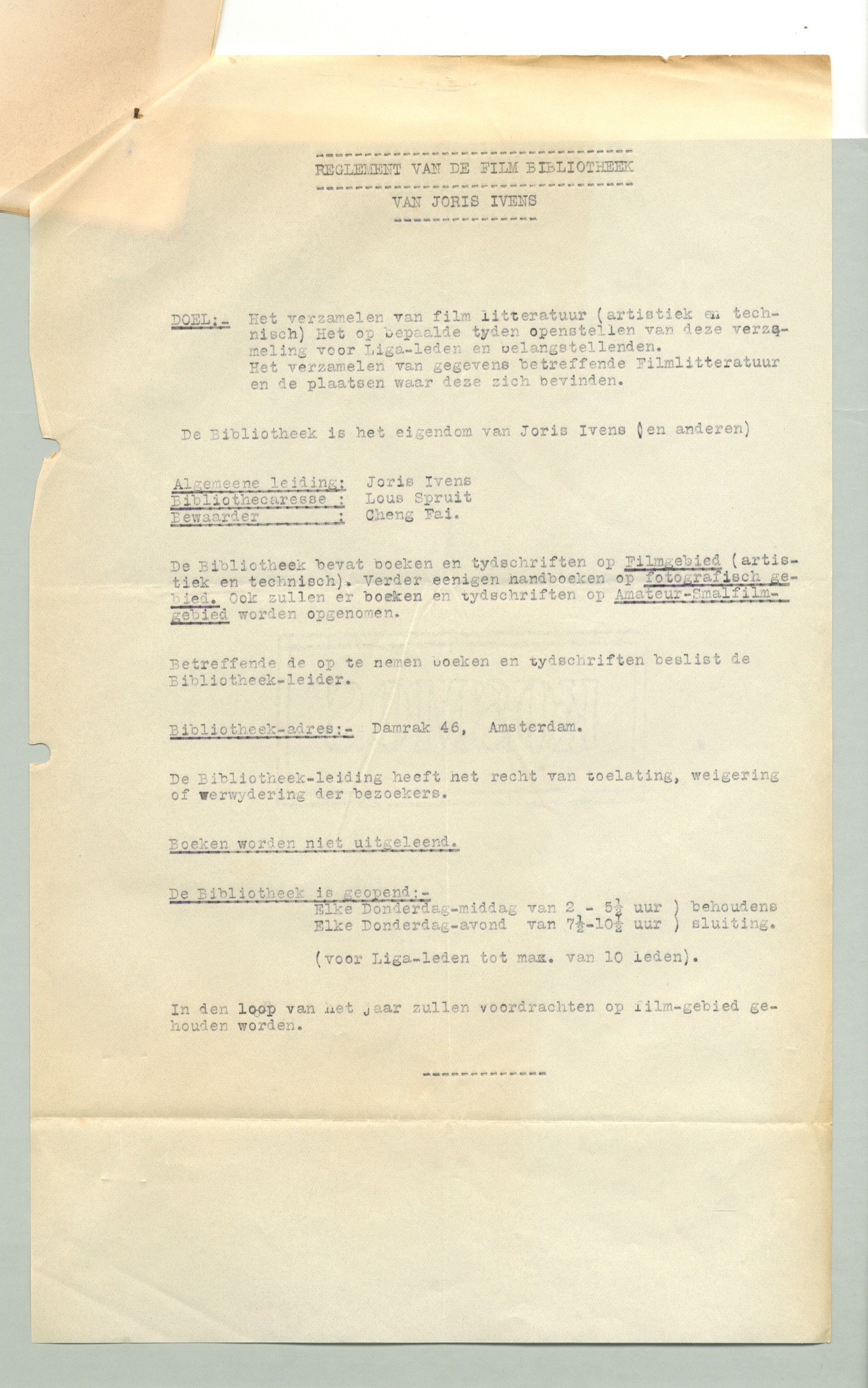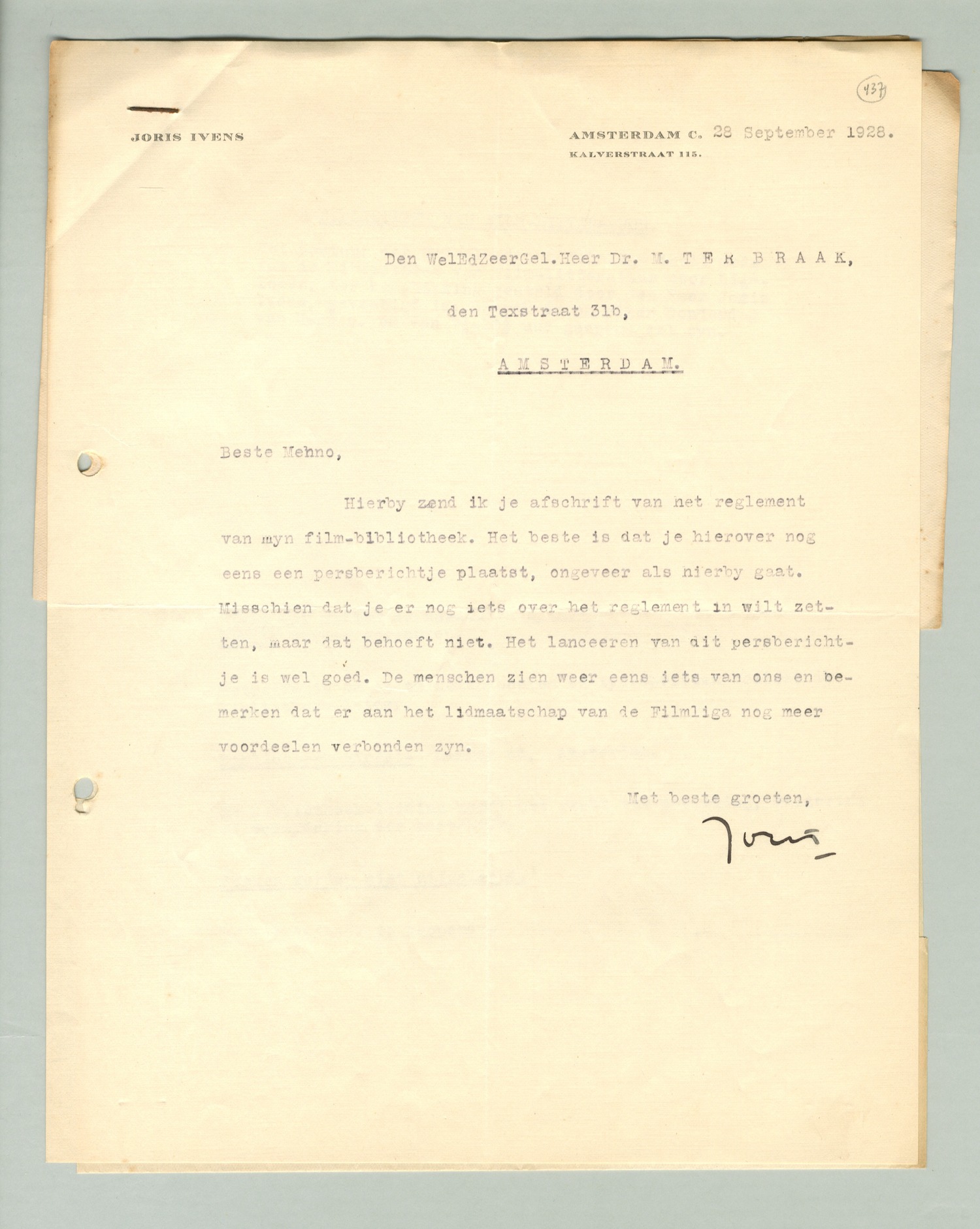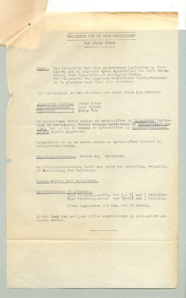 Hierbij zend ik je afschrift van het reglement van mijn film-bibliotheek. Het beste is dat je hierover nog eens een persberichtje plaatst, ongeveer als hierbij gaat. Misschien dat je er nog iets over het reglement in wilt zetten, maar dat behoeft niet. Het lanceeren van dit persberichtje is wel goed. De menschen zien weer eens iets van ons en bemerken dat er aan het lidmaatschap van de Filmliga nog meer voordeelen verbonden zijn.