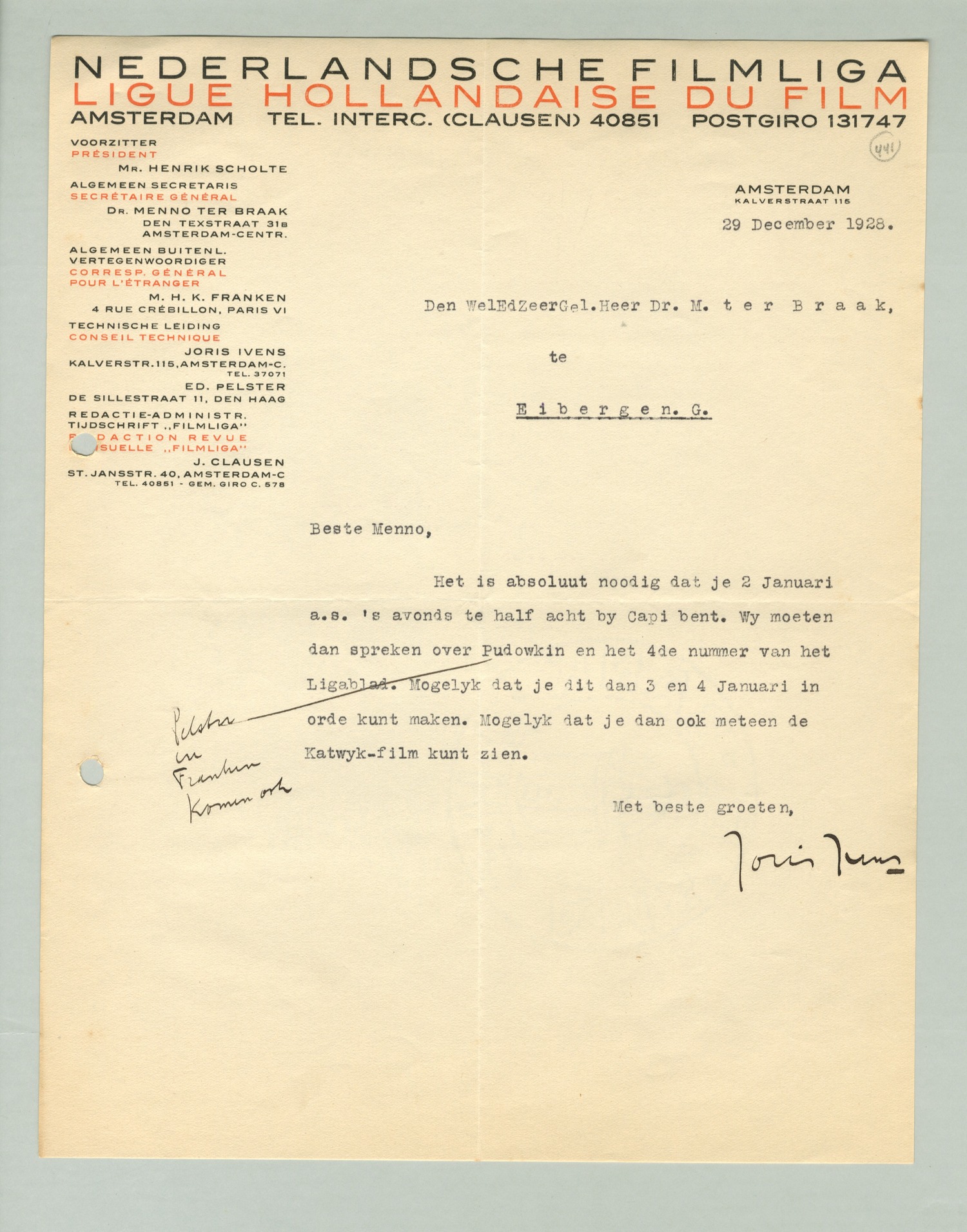 Het is absoluut noodig dat je 2 Januari a.s. 's avonds te half acht bij Capi bent. Wij moeten dan spreken over Pudowkin (Pelster en Franken komen ook) en het 4de nummer van het Ligablad. Mogelijk dat je dit dan 3 en 4 januari in orde kunt maken. Mogelijk dat je dan ook meteen de Katwijk-film kunt zien.