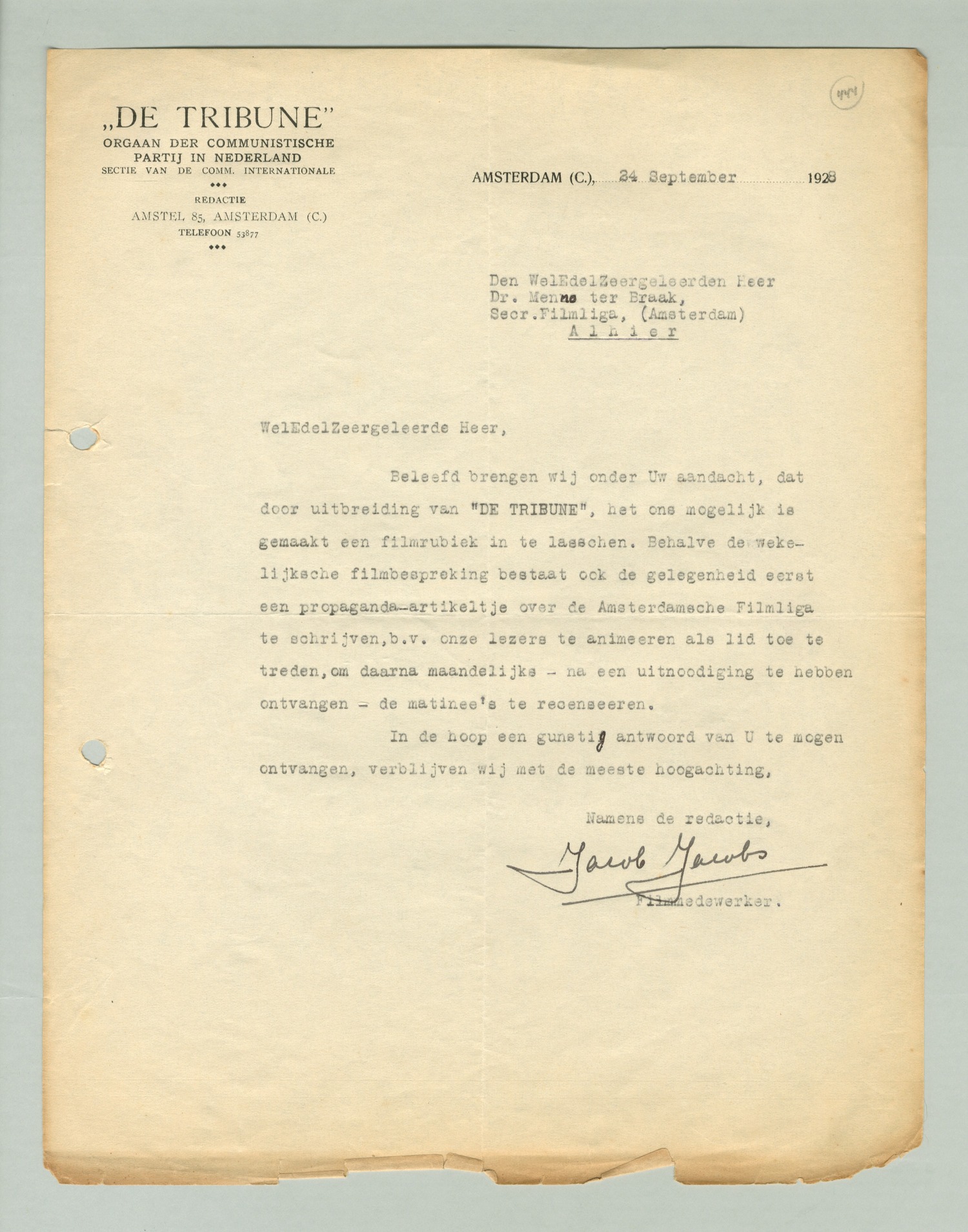 Beleefd brengen wij onder Uw aandacht, dat door uitbreiding van De Tribune, het ons mogelijk is gemaakt een filmrubriek in te lasschen. Behalve de wekelijksche filmbespreking bestaat ook de gelegenheid eerst een propaganda-artikeltje over de Amsterdamsche Filmliga te schrijven, b.v. om onze lezers te animeeren als lid toe te treden, om daarna maandelijks - na een uitnoodiging te hebben ontvangen - de matinee's te recenseeren.