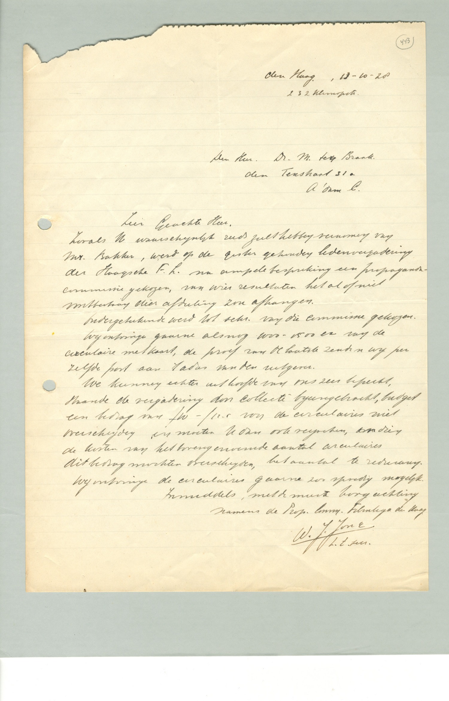 Zooals U waarschijnlijk reeds zult hebben vernomen van Mr. Bakker, werd op de gister gehouden ledenvergadering der Haagsche F.L. na ampele bespreking een propagada-commissie gekozen, van wier resultaten het al of niet voortbestaan dier afdeeling zou afhangen.