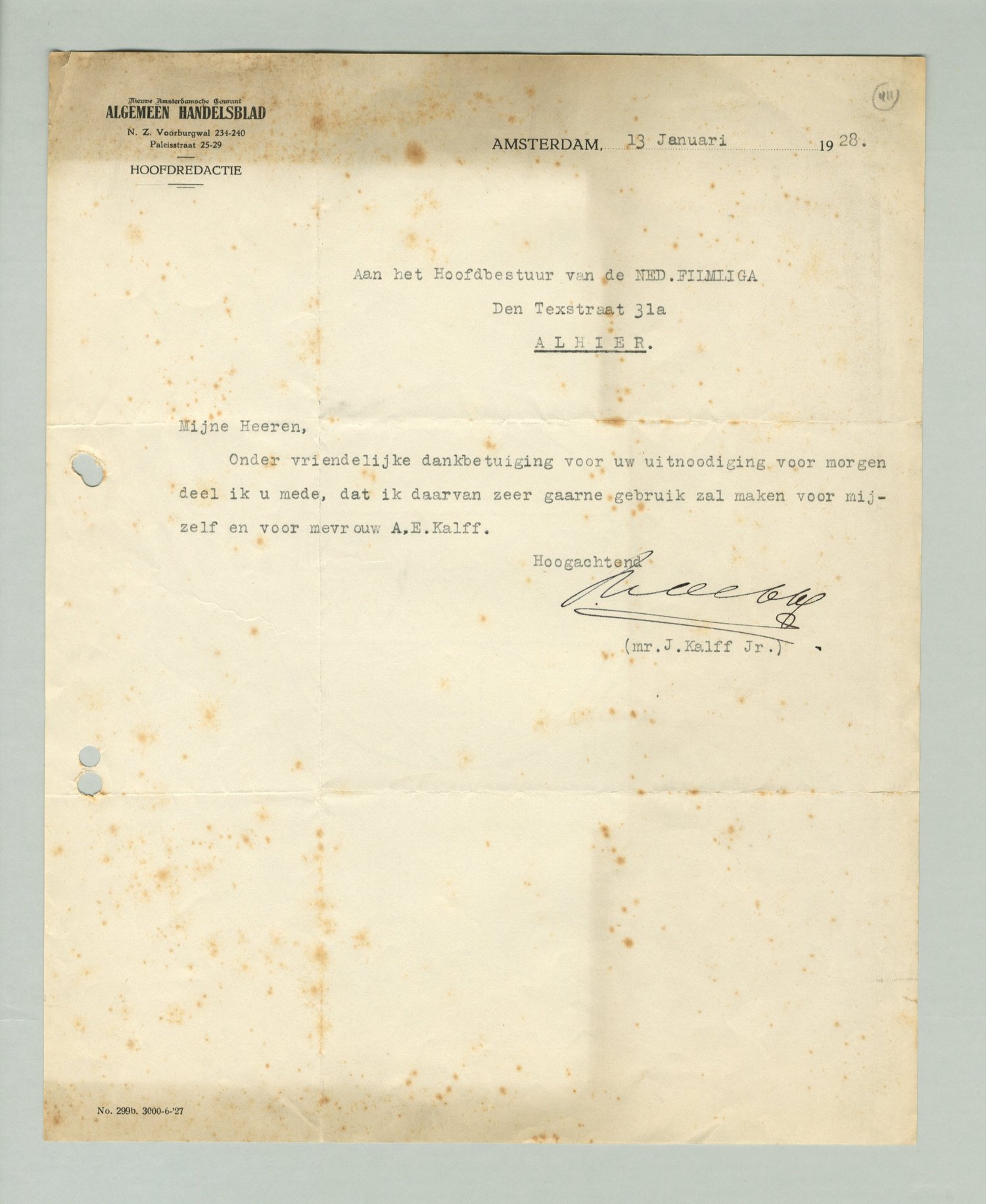 Onder vriendelijke dankbetuiging voor uw uitnoodiging voor morgen deel ik u mede, dat ik daarvan zeer gaarne gebruik zal maken voor mijzelf en voor mevrouw A.E. Kalff.