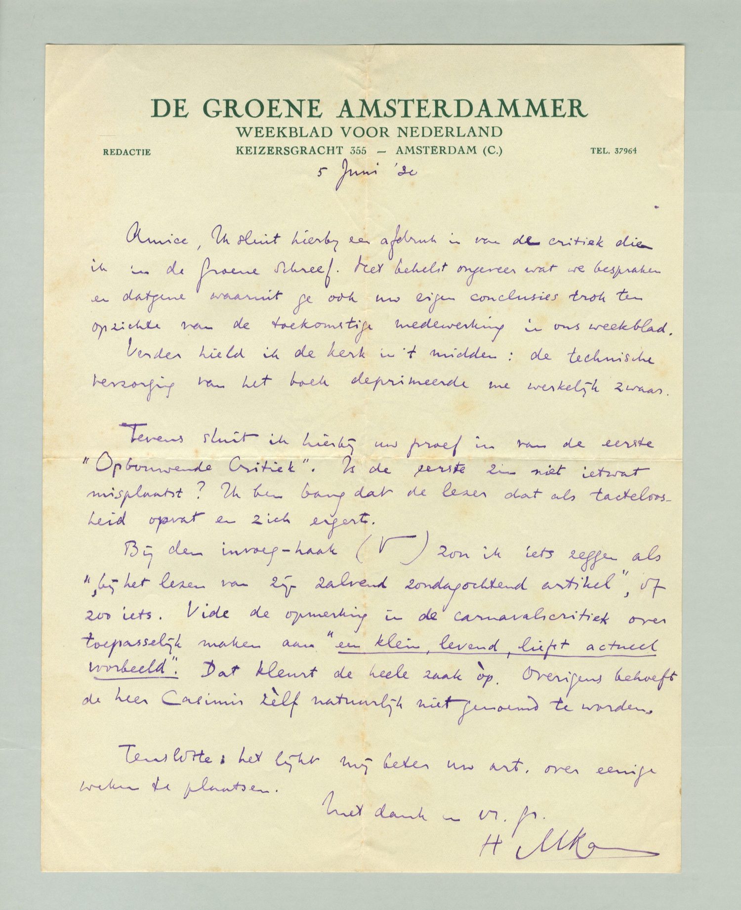 Ik sluit hierbij een afdruk in van de critiek die ik in de Groene schreef. Het behelst ongeveer wat we bespraken en datgene waaruit ge ook uw eigen conclusies trok ten opzichte van de toekomstige medewerking in ons weekblad.