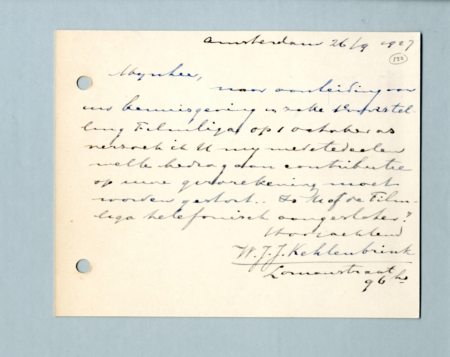 naar aanleiding van uw kennisgeving in zake de voorstelling Filmliga op 1 october as verzoek ik U nog mede te deelen welk bedrag aan contributie op uwe girorekening moet worden gestort. Is U of de Filmliga telefonisch aangesloten?