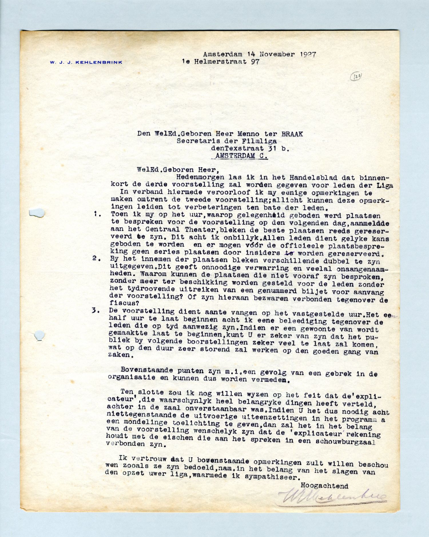 | 1. | Toen ik mij op het uur, waarop gelegenheid geboden werd plaatsen te bespreken voor de voorstelling op den volgenden dag, aanmeldde aan het Centraal Theater, bleken de beste plaatsen reeds gereserveerd te zijn. Dit acht ik onbillijk. Allen leden dient gelijke kans geboden te worden en er mogen vóór de officieele plaatsbespreking geen series plaatsen door insiders worden gereserveerd. |