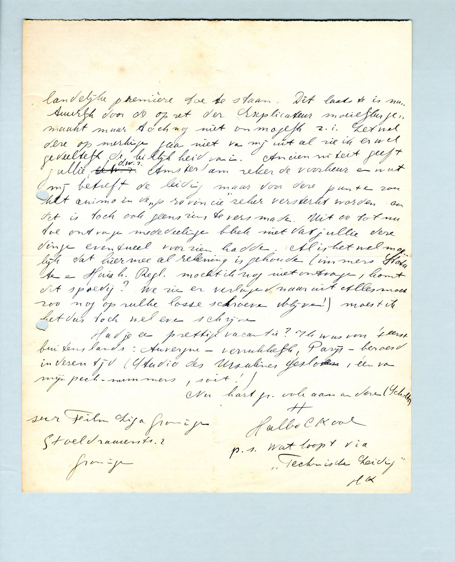 Nog is mij verzocht te informeeren door wie eigenlijk de samenstelling der programma's geschiedt, of het niet wenschelijk zou zijn ook de hoofdbestuursleden der zusterliga's hierin althans theoretisch stem te geven, evenals hun ook eens een landelijke première toe te staan. Dit laatste is natuurlijk door de opzet der Explicateur moeilijker gemaakt maar toch nog niet onmogelijk z.i. Let wel deze opmerkingen gaan niet van mij uit al zie ik er wel gedeeltelijk de billijkheid van in. Ancienniteit geeft jullie, d.w.z. Amsterdam zeker de voorkeur en wat mij betreft de leiding maar door deze punten zou het animo in de ‘provincie’ zeker versterkt worden en dit is toch ook geenszins te versmaden. Uit de tot nu toe ontvangen mededeelingen bleek niet dat jullie deze dingen eventueel voorzien hadden. Al is het wel mogelijk dat hiermee al rekening is gehouden (immers Statuten en Huish. Regl. mocht ik nog niet ontvangen, komt dit spoedig? We zien er verlangend naar uit. Alles moet zoo nog op zulke losse schroeven blijven!) moest ik het dus toch wel even schrijven.