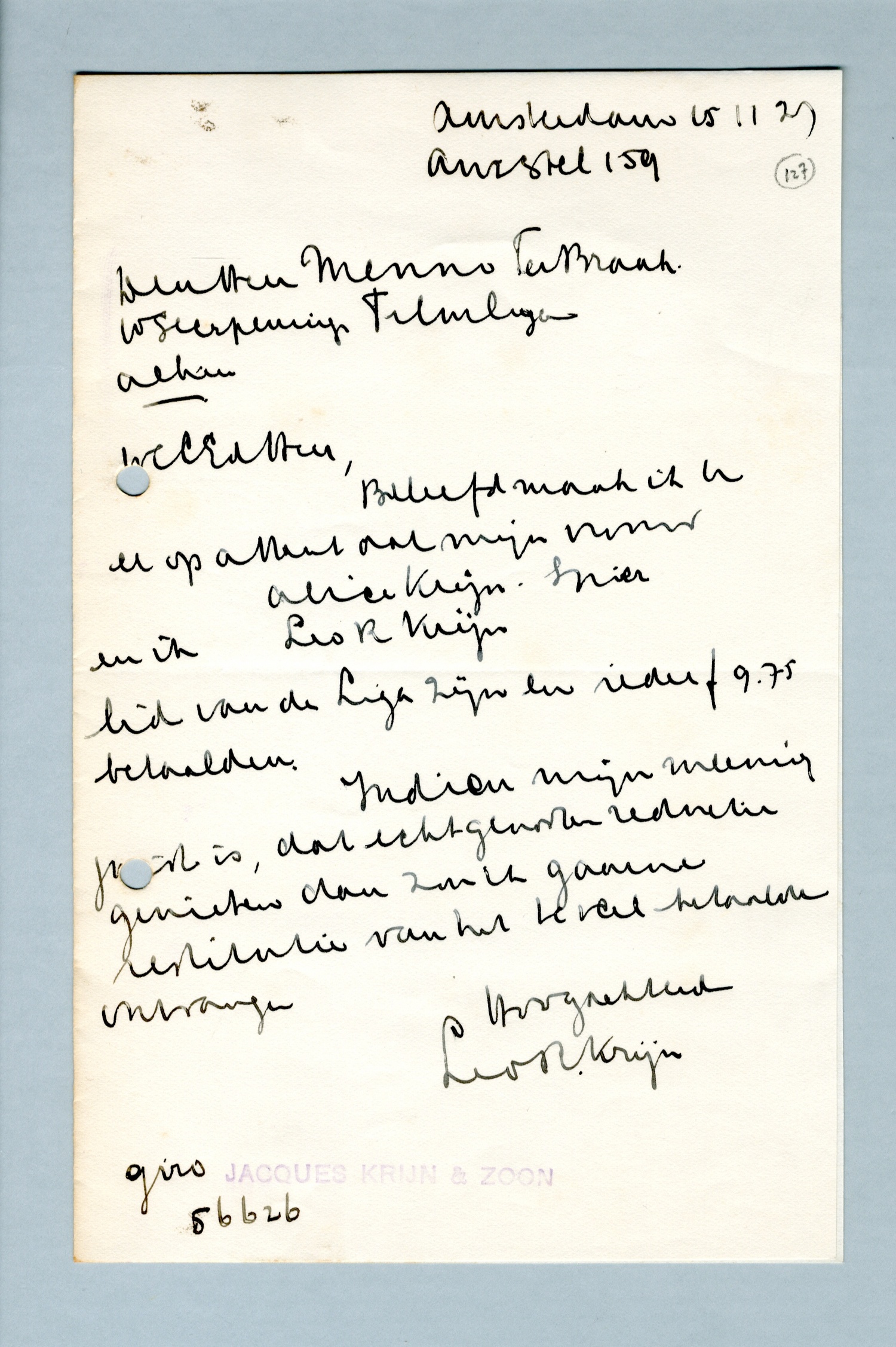 Beleefd maak ik u er op attent dat mijn vrouw Alice Krijn-Spier en ik Leo R Krijn lid van de Liga zijn en ieder f 9.75 betaalden.