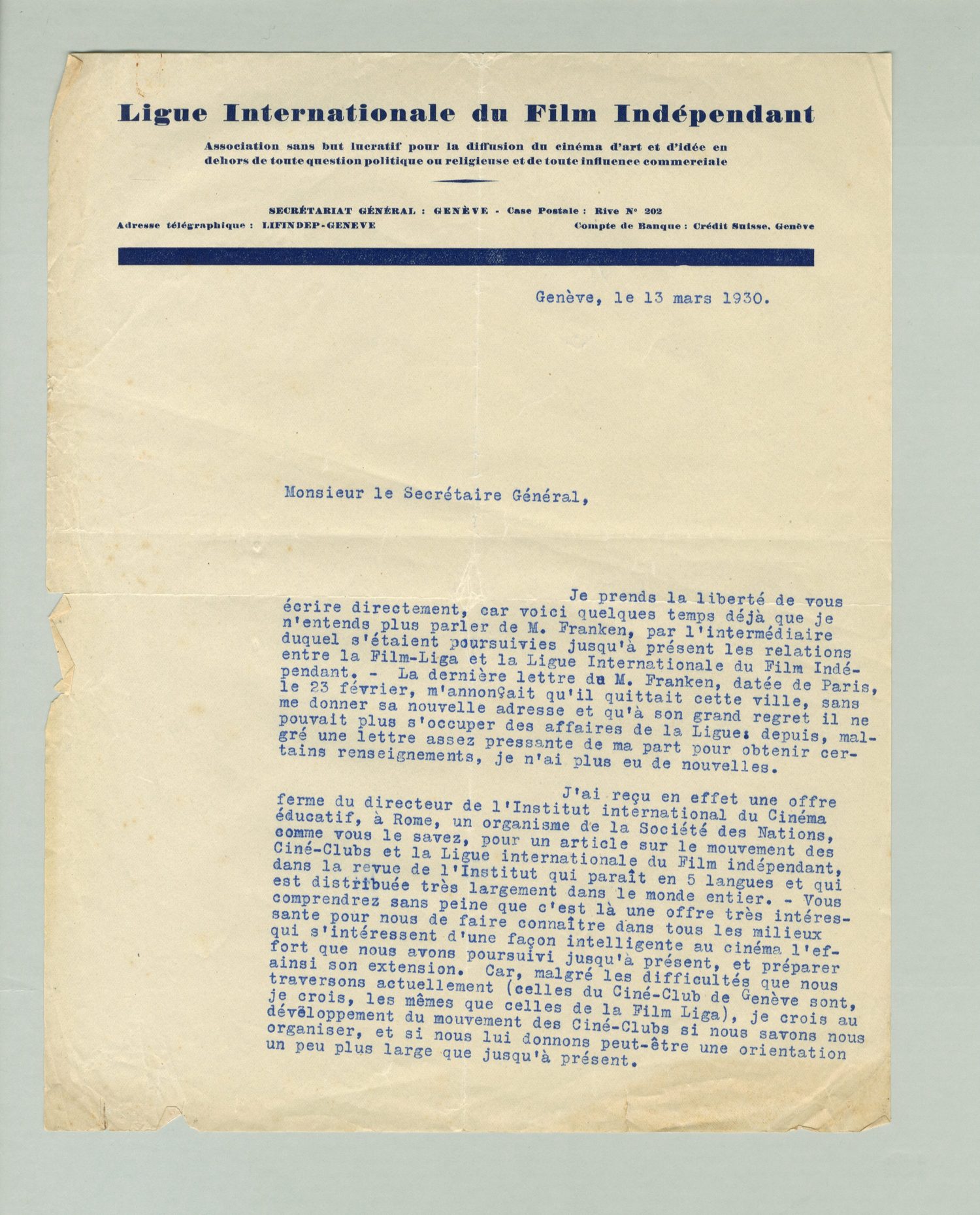 Je prends la liberté de vous écrire directement, car voici quelque temps déjà que je n'entends plus parler de M. Franken, par l'intermédiaire duquel s'étaient poursuivies jusqu'à présent les relations entre la Film-Liga et la Ligue Internationale du Film Indépendant. - La dernière lettre de M. Franken, datée de Paris, le 23 février, m'annonçait qu'il quittait cette ville, sans me donner sa nouvelle adresse et qu'à son grand regret il ne pouvait plus s'occuper des affaires de la Ligue: depuis, malgré une lettre assez pressante de ma part pour obtenir certains renseignements, je n'ai plus eu de nouvelles.