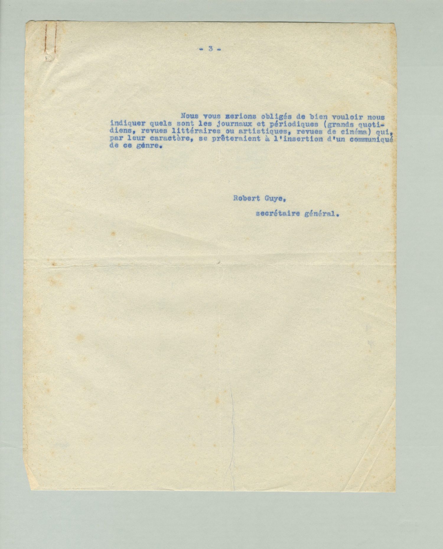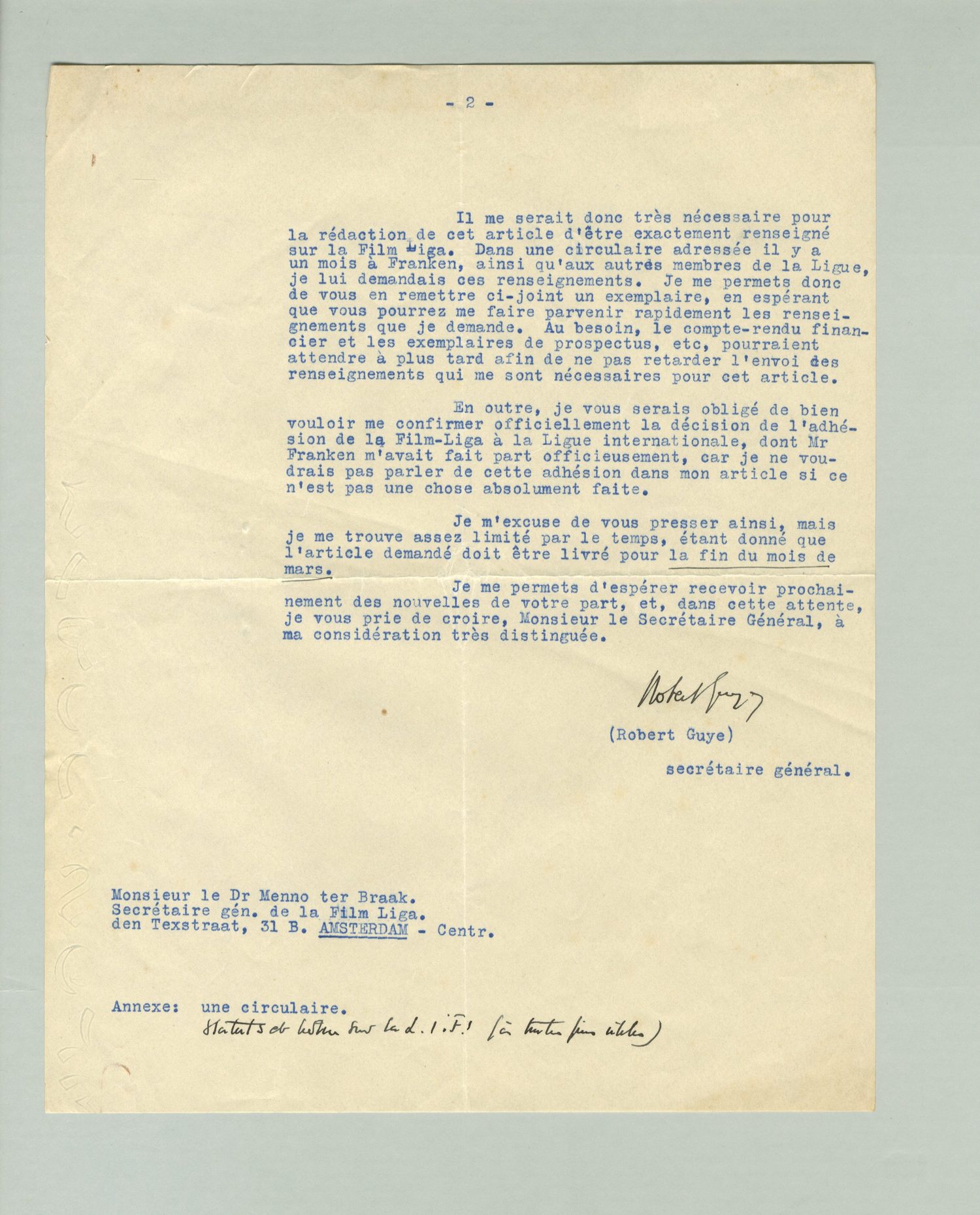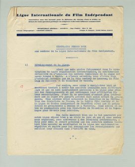 Il me serait donc très nécessaire pour la rédaction de cet aticle d'être exactement renseigné sur la Film Liga. Dans une circulaire adressée il y a un mois à Franken, ainsi qu'aux autres membres de la Ligue, je lui demandais ces renseignements. Je me permets donc de vous en remettre ci-joint un exemplaire, en espérant que vous pourrez me faire parvenir rapidement les renseignements que je demande. Au besoin, le compte-rendu financier et les exemplaires de prospectus, etc, pourraient attendre à plus tard afin de ne pas retarder l'envoi des renseigenements qui me sont nécessaires pour cet article.