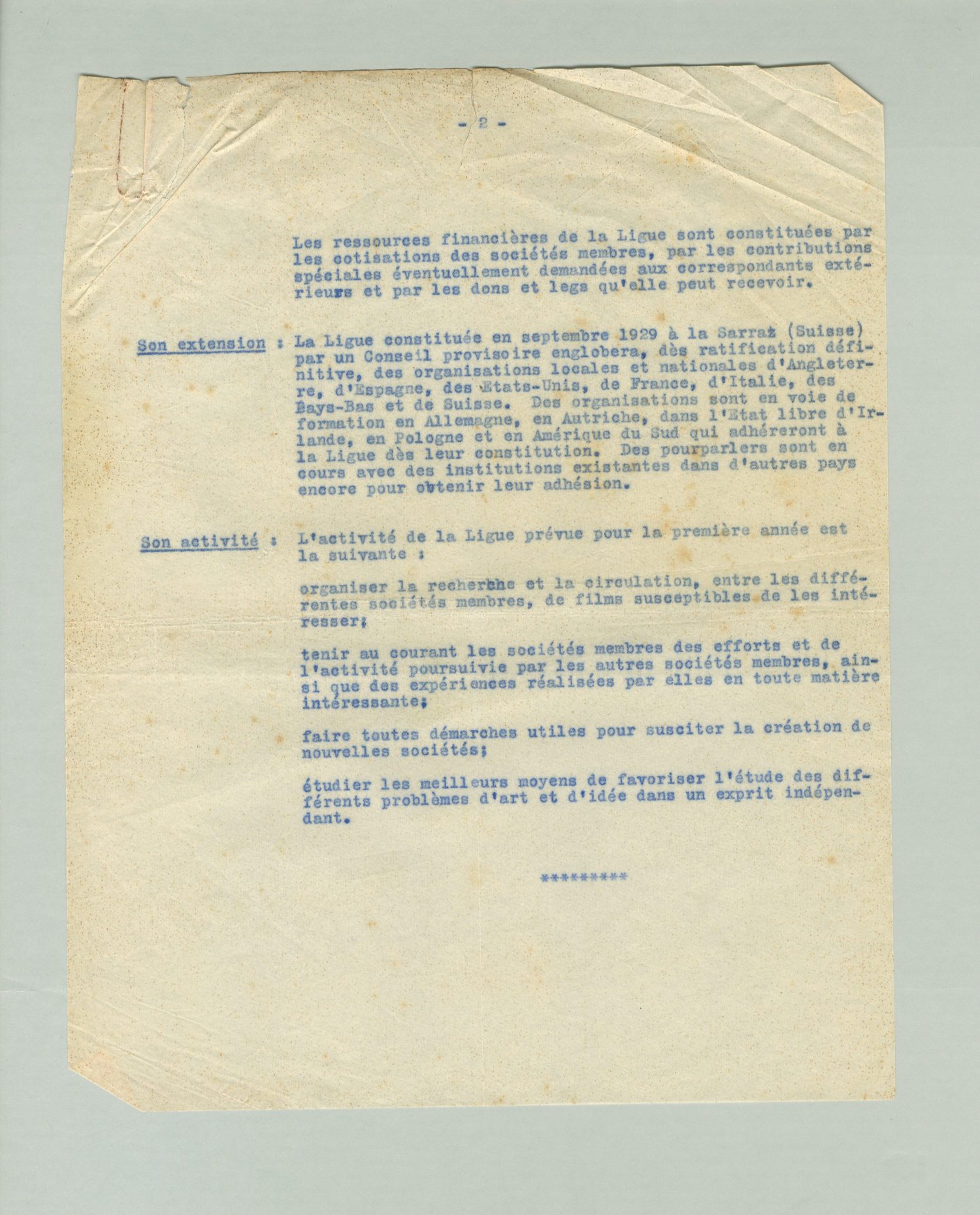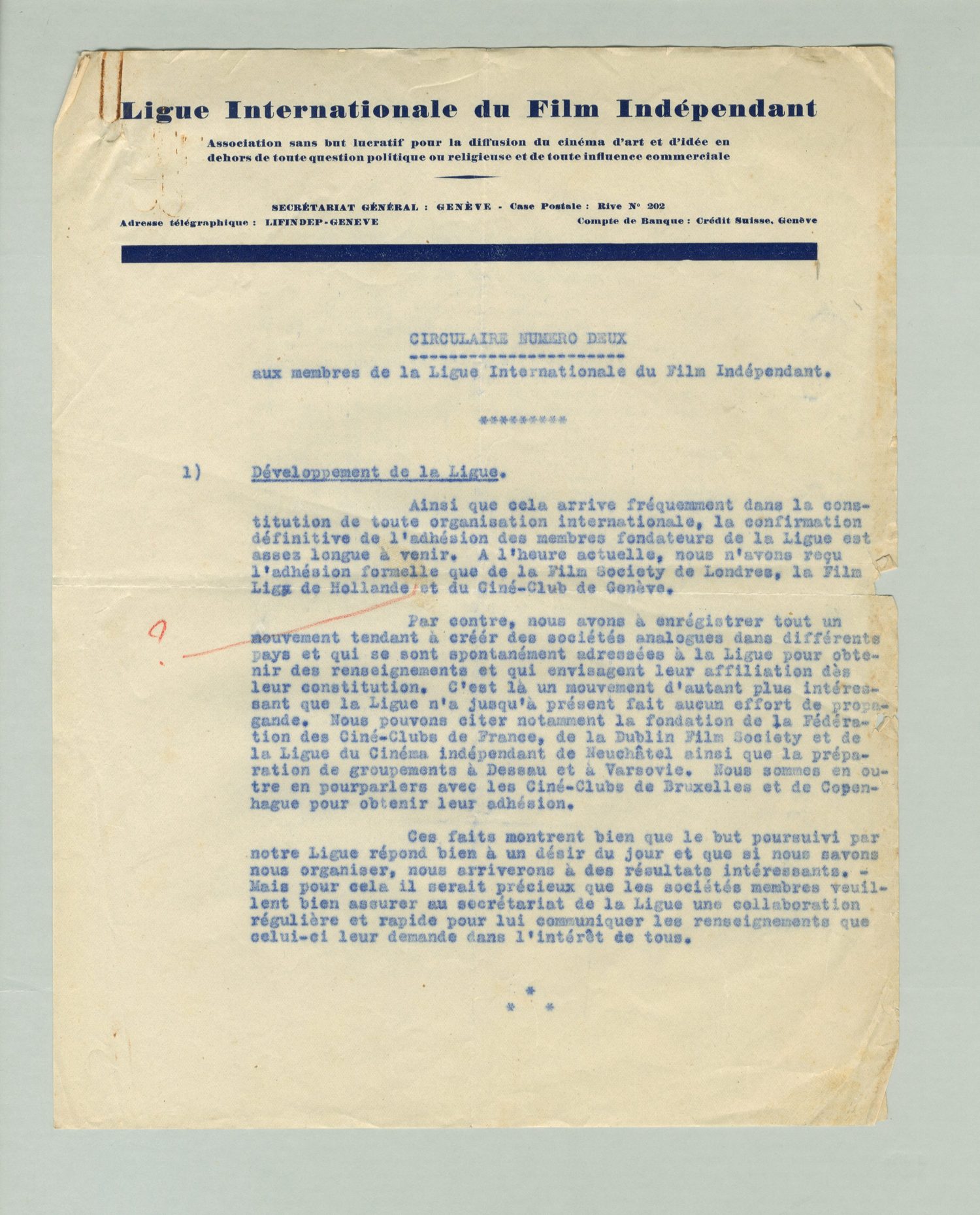 J'ai reçu en effet une offre ferme du directeur de l'Institut international du Cinéma éducatif, à Rome, un organisme de la Société des Nations, comme vous le savez, pour un article sur le mouvement des Ciné-Clubs et la Ligue internationale du Film indépendant, dans la revue de l'Institut qui paraît en 5 langues et qui est distribuée très largement dans le monde entier. - Vous comprendez sans peine que c'est là une offre très intéressante pour nous de faire connaître dans tous les millieux qui s'intéressent d'une façon intelligente au cinéma l'effort que nous avons poursuivi jusqu'à présent, et préparer ainsi son extension. Car, malgré les difficultés que nous traversons actuellement (celles du Ciné-Club de Genève sont, je crois, les mêmes que celles de la Film Liga), je crois au développement du mouvement des Ciné-Clubs si nous savons nous organiser, et si nous lui donnons peut-être une orientation un peu plus large que jusqu'à présent.