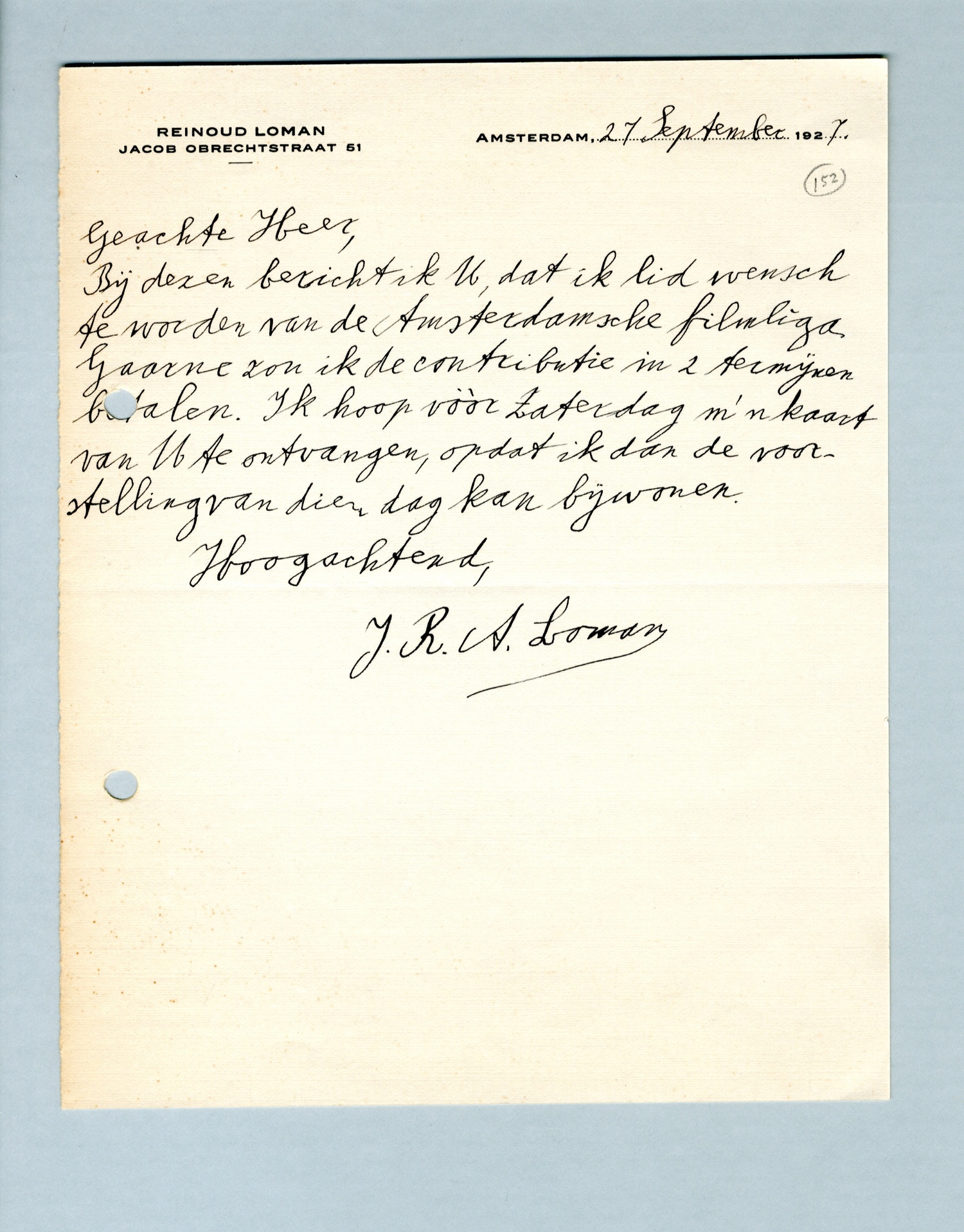 Bij dezen bericht ik U, dat ik lid wensch te worden van de Amsterdamsche filmliga. Gaarne zou ik de contributie in 2 termijnen betalen. Ik hoop vòòr Zaterdag m'n kaart van U te ontvangen, opdat ik dan de voorstelling van dien dag kan bijwonen.