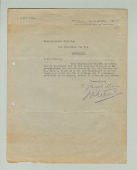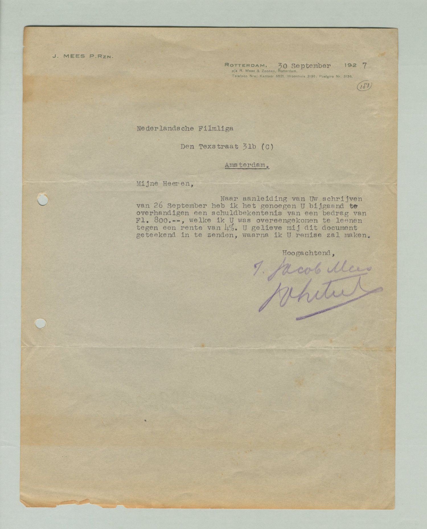 Naar aanleiding van Uw schrijven van 26 September heb ik het genoegen U bijgaand te overhandigen een schuldbekentenis van een bedrag van Fl. 800.--, welke ik U was overeengekomen te leenen tegen een rente van 4%. U gelieve mij dit document geteekend in te zenden, waarna ik U remise zal maken.