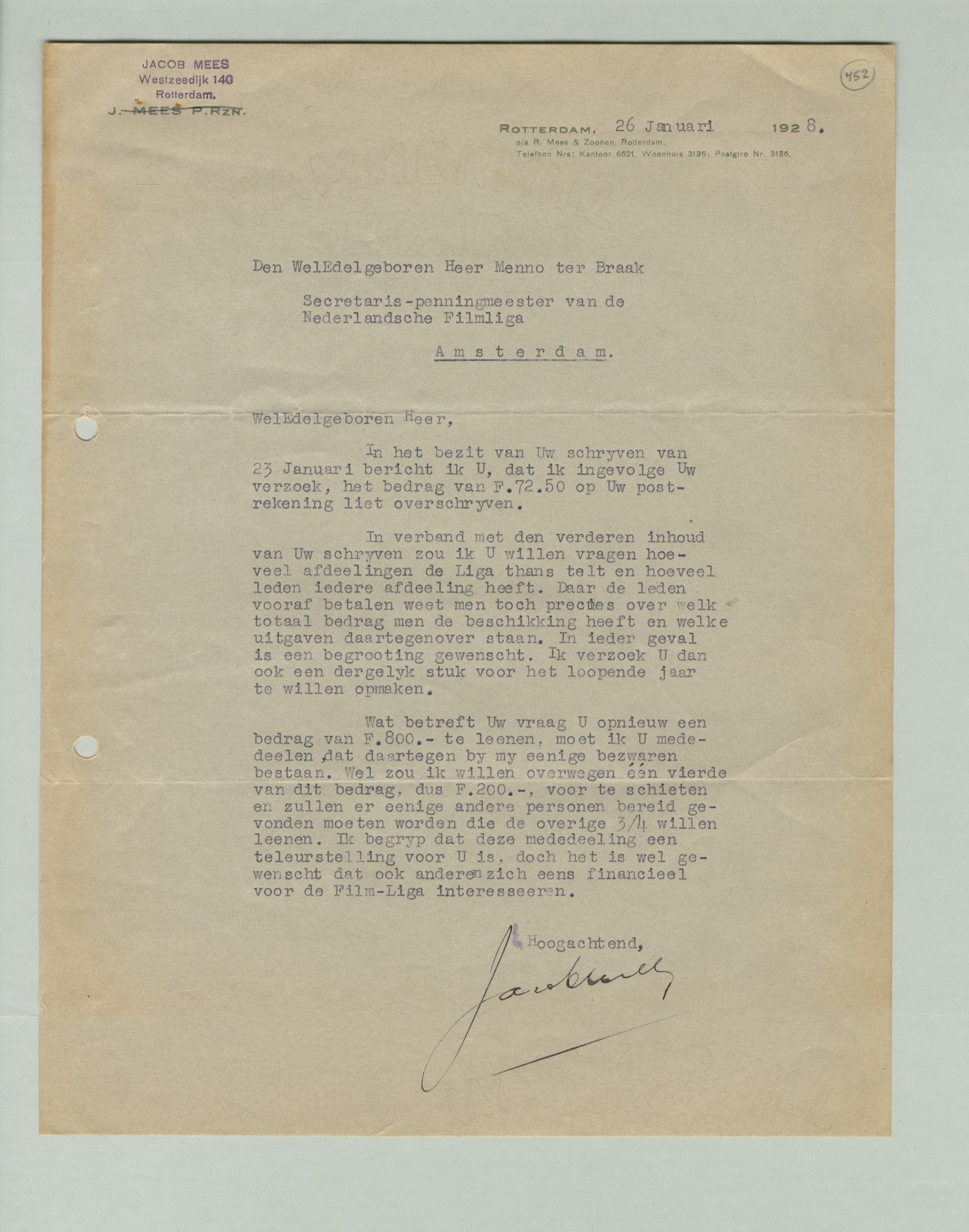 Wat betreft Uw vraag U opnieuw een bedrag van F.800.- te leenen, moet ik U mededeelen, dat daartegen bij mij eenige bezwaren bestaan. Wel zou ik willen overwegen één vierde van dit bedrag, dus F.200.-, voor te schieten en zullen er eenige andere personen bereid gevonden moeten worden die de overige 3/4 willen leenen. Ik begrijp dat deze mededeeling een teleurstelling voor U is, doch het is wel gewenscht dat ook anderen zich eens financieel voor de Film-Liga interesseeren.