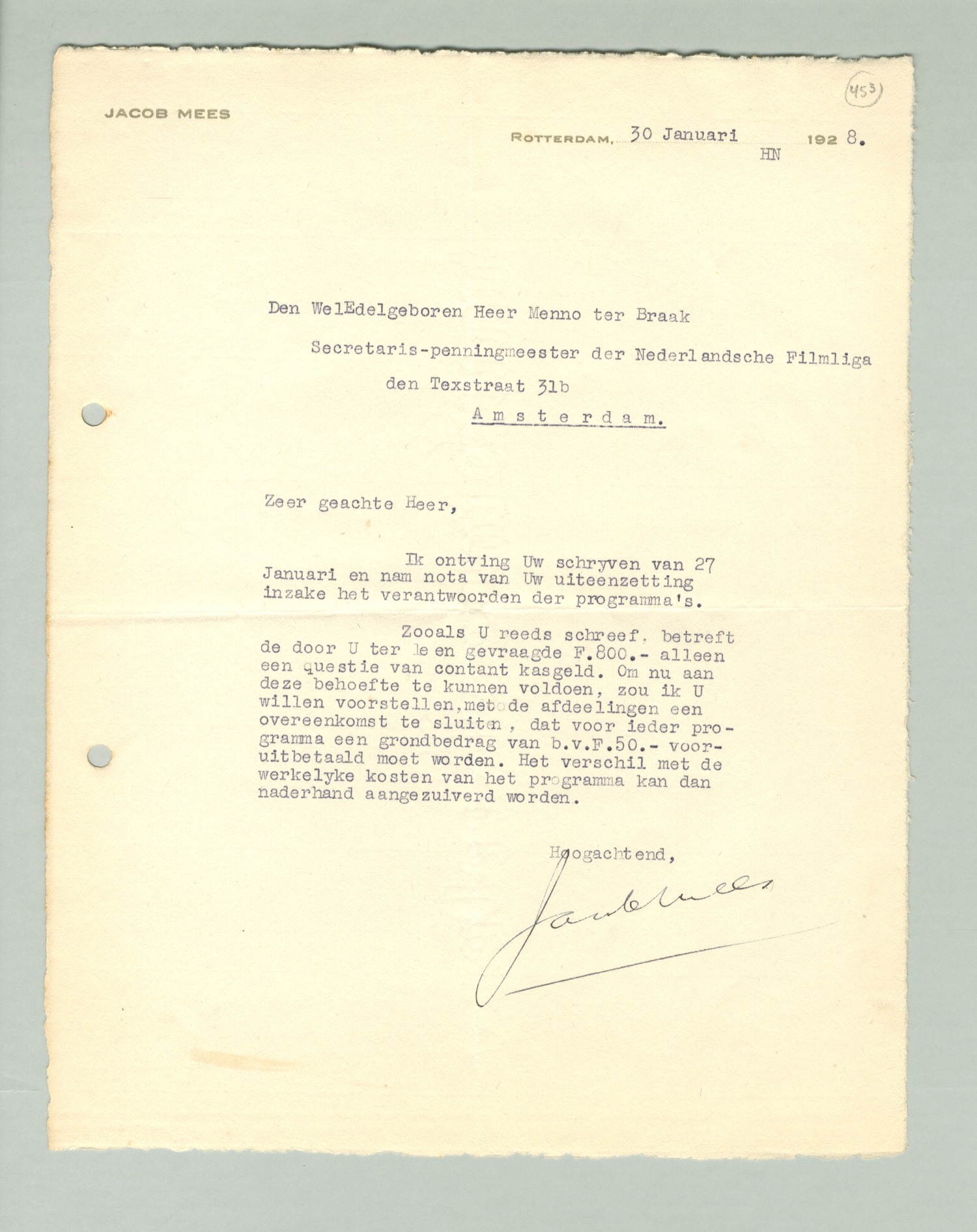 Zooals U reeds schreef, betreft de door U ter leen gevraagde F.800.- alleen een questie van contant kasgeld. Om nu aan deze behoefte te kunnen voldoen, zou ik U willen voorstellen, met de afdeelingen een overeenkomst te sluiten, dat voor ieder programma een grondbedrag van b.v. F.50.- vooruitbetaald moet worden. Het verschil met de werkelijke kosten van het programma kan dan naderhand aangezuiverd worden.