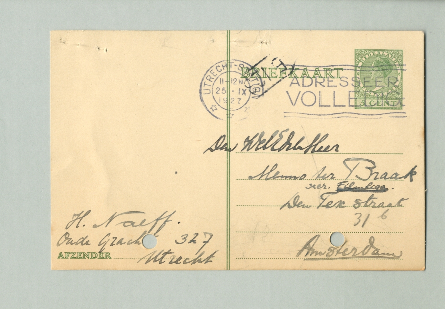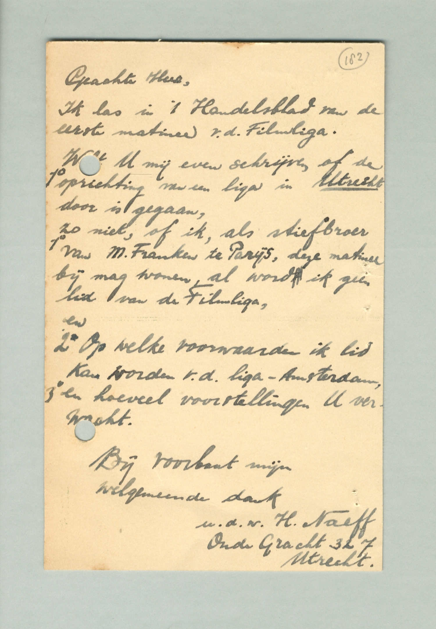Wilt U mij even schrijven 1e of de oprichting van een liga in Utrecht door is gegaan, zo niet, of ik, als stiefbroer van M. Franken te Parijs, deze matinee bij mag wonen, al word ik geen lid van de Filmliga, en 2e op welke voorwaarden ik lid kan worden v.d. liga-Amsterdam en 3e hoeveel voorstellingen U verwacht.
