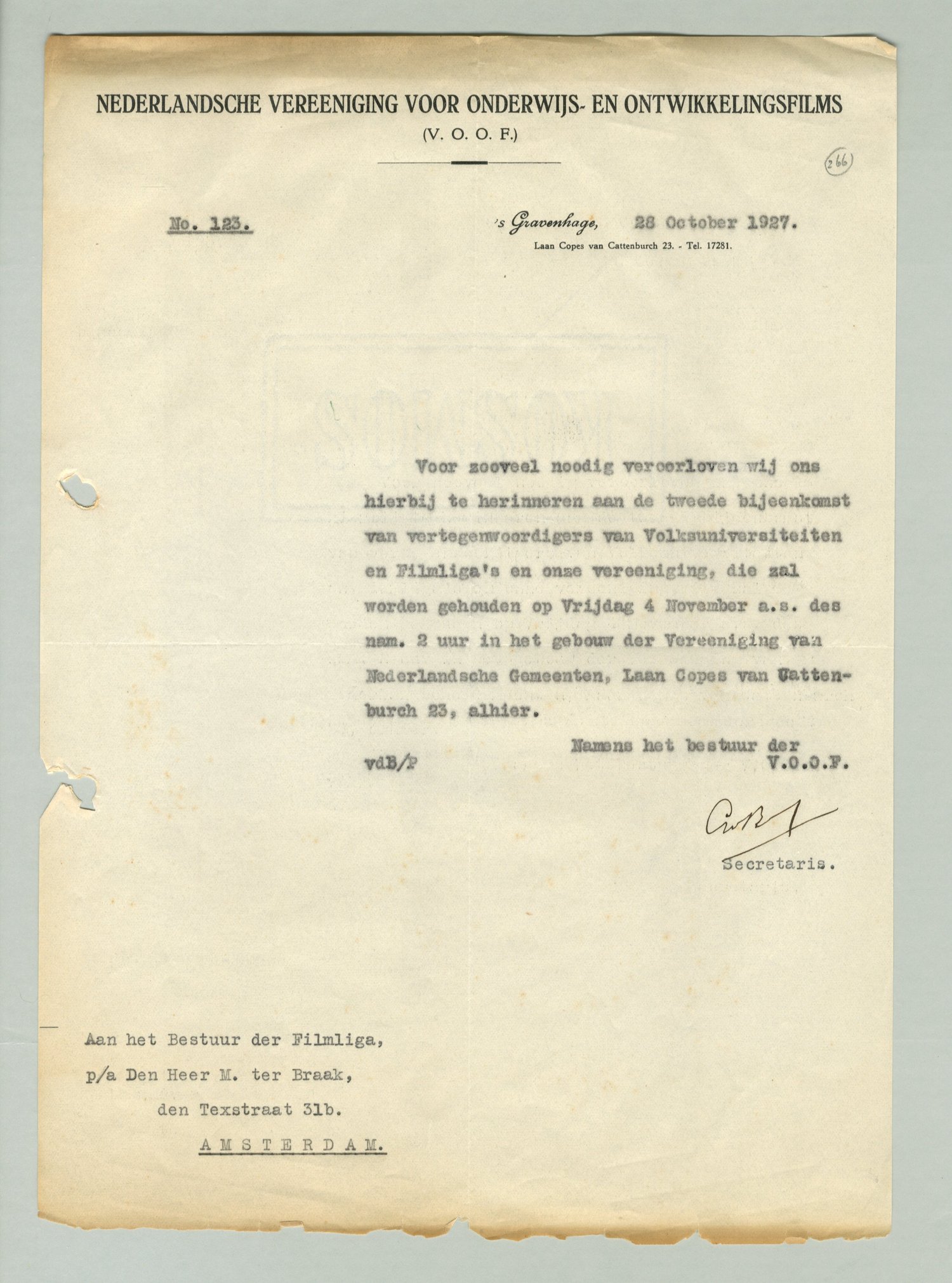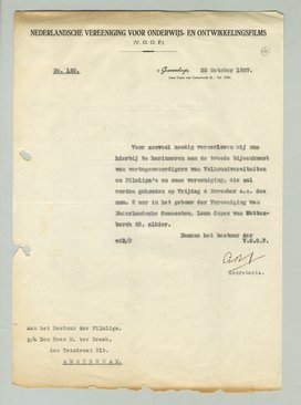 Voor zooveel noodig veroorloven wij ons hierbij te herinneren aan de tweede bijeenkomst van vertegenwoordigers van Volksuniversiteiten en Filmliga's en onze vereeniging, die zal worden gehouden op Vrijdag 4 November a.s. des nam. 2 uur in het gebouw der Vereeniging van Nederlandsche Gemeenten, Laan Copes van Cattenburch 23, alhier.