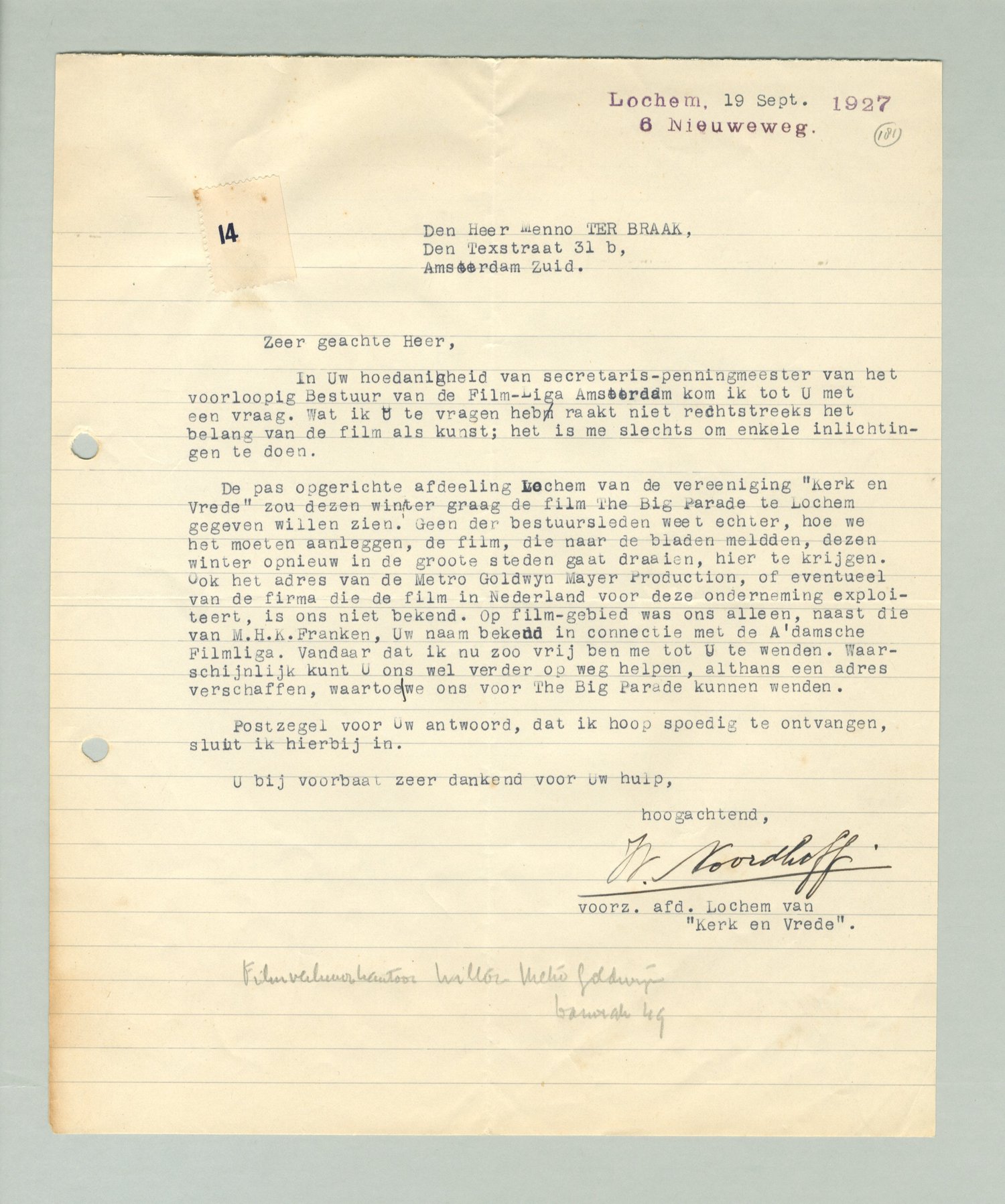 De pas opgerichte afdeeling Lochem van de vereeniging ‘Kerk en Vrede’ zou dezen winter graag de film The Big Parade te Lochem gegeven willen zien. Geen der bestuursleden weet echter, hoe we het moeten aanleggen, de film, die naar de bladen meldden, dezen winter opnieuw in de groote steden gaat draaien, hier te krijgen. Ook het adres van de Metro Goldwyn Mayer Production, of eventueel van de firma die de film in Nederland voor deze onderneming exploiteert, is ons niet bekend. Op film-gebied was ons alleen, naast die van M.H.K. Franken, Uw naam bekend in connectie met de A'damsche Filmliga. Vandaar dat ik nu zoo vrij ben me tot U te wenden. Waarschijnlijk kunt U ons wel verder op weg helpen, althans een adres verschaffen, waartoe we ons voor The Big Parade kunnen wenden.