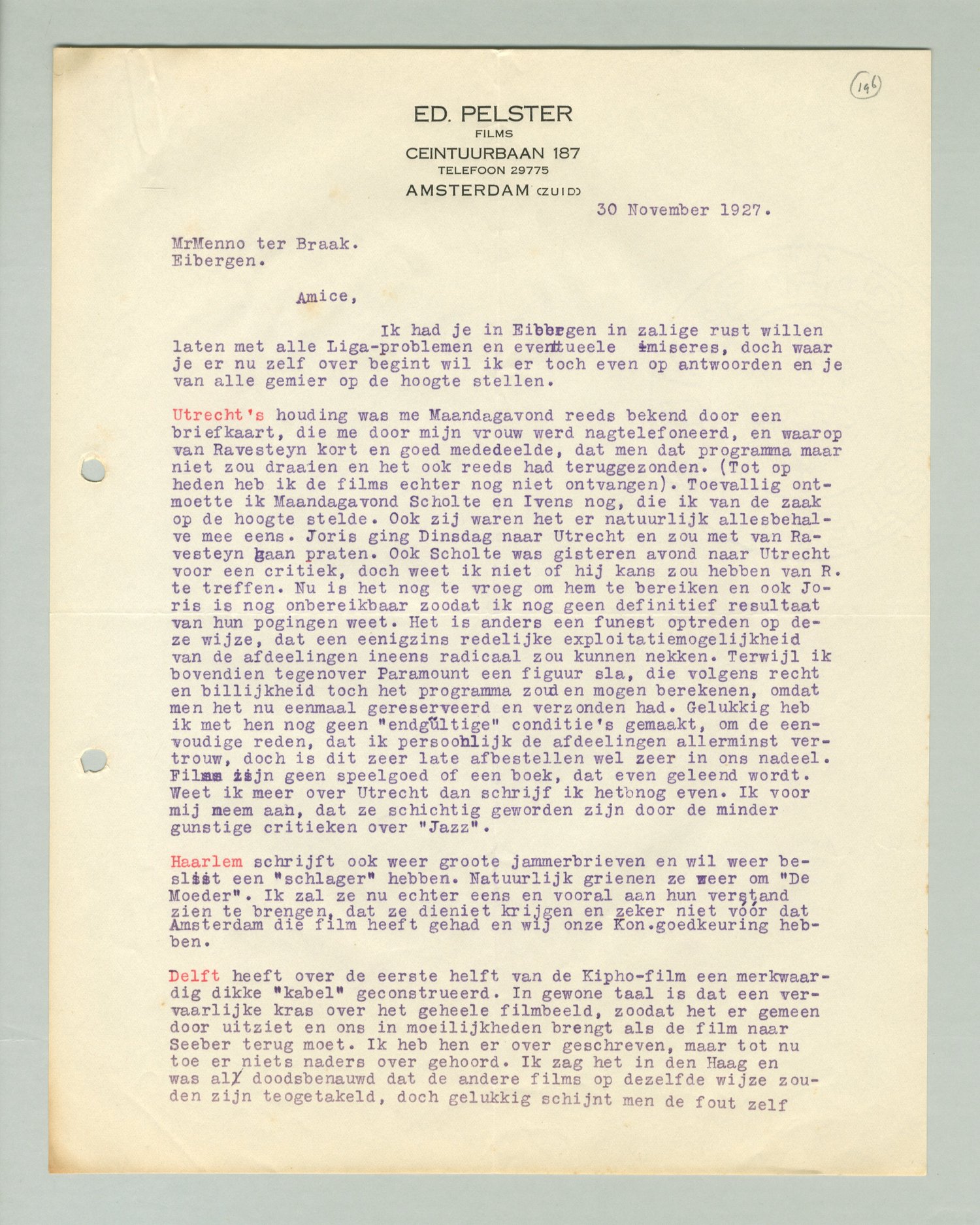 Haarlem schrijft ook weer groote jammerbrieven en wil weer beslist een ‘schlager’ hebben. Natuurlijk grienen ze weer om De Moeder. Ik zal ze nu echter eens en vooral aan hun verstand zien te brengen, dat ze die niet krijgen en zeker niet voordat Amsterdam die film heeft gehad en wij onze Kon. goedkeuring hebben.
