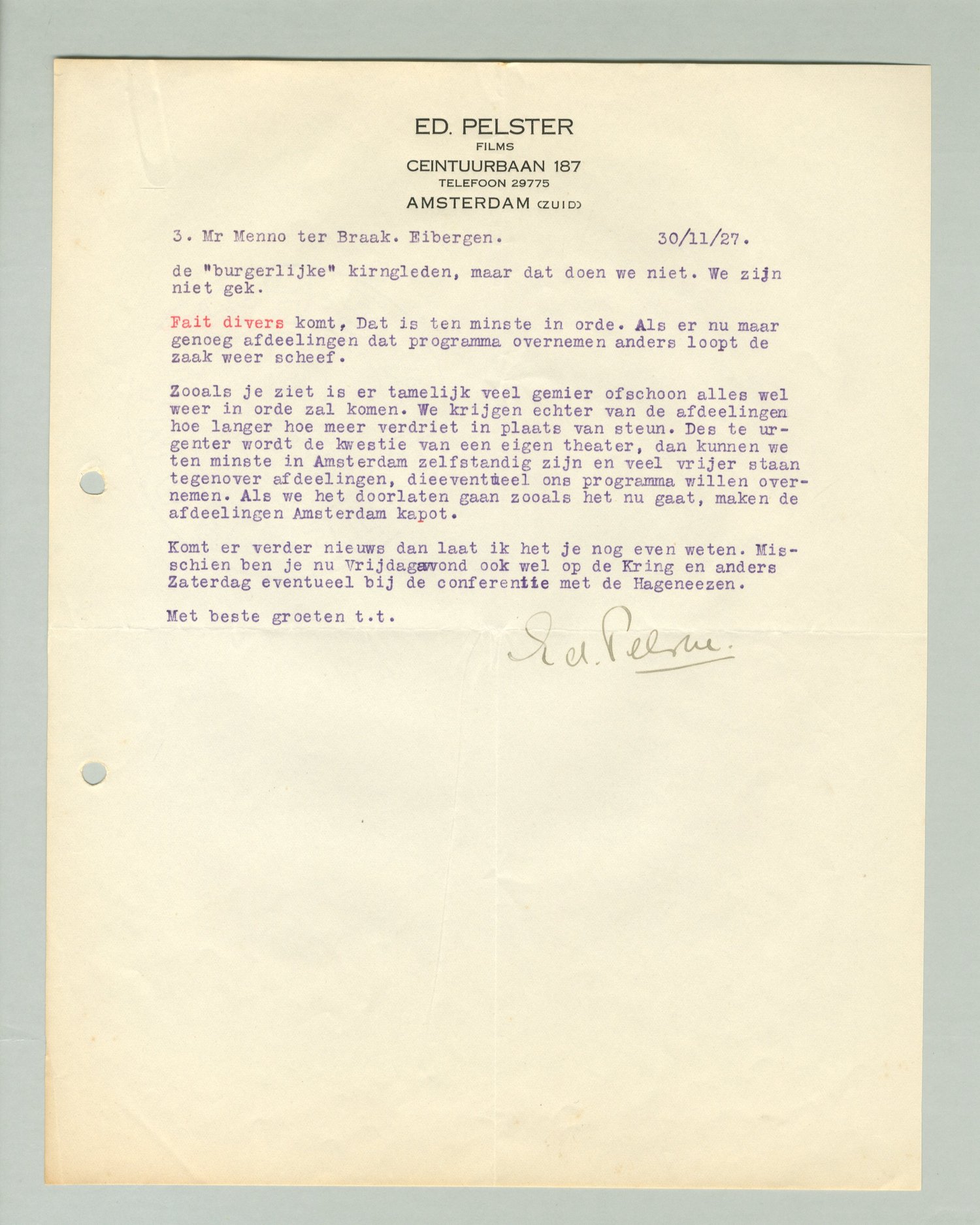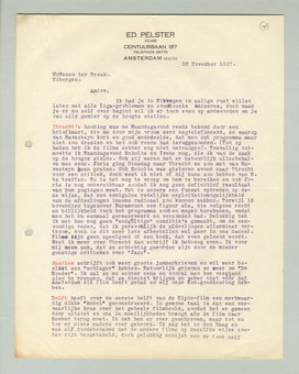 Zooals je ziet is er tamelijk veel gemier ofschoon alles wel weer in orde zal komen. We krijgen echter van de afdeelingen hoe langer hoe meer verdriet in plaats van steun. Des te urgenter wordt de kwestie van een eigen theater, dan kunnen we ten minste in Amsterdam zelfstandig zijn en veel vrijer staan tegenover afdeelingen, die eventueel ons programma willen overnemen. Als we het door laten gaan zooals het nu gaat, maken de afdeelingen Amsterdam kapot.